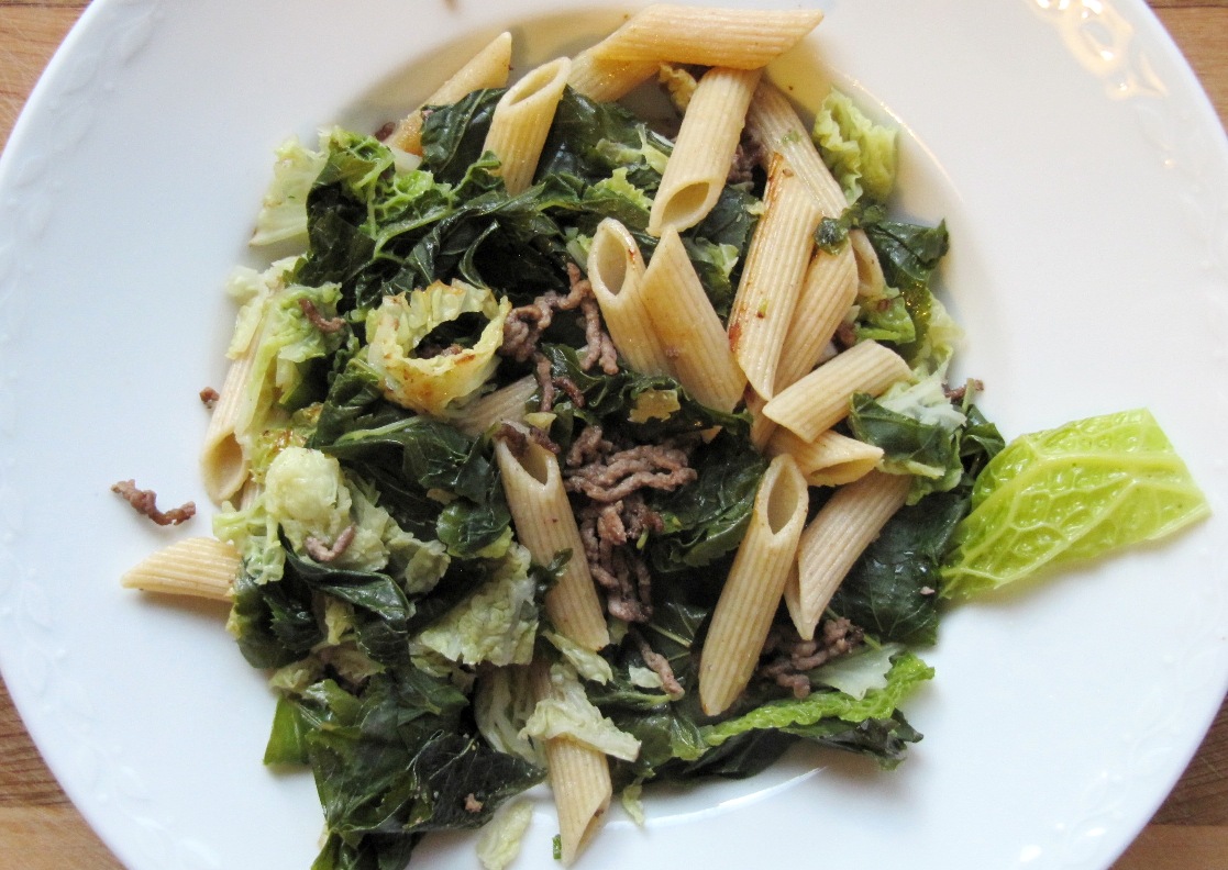 Mein Garten liefert verlässliche Woche für Woche neuen Giersch. Ich stelle mir daher weiterhin die Frage, was sich aus dieser Pflanze machen lässt. Jürgen Dahl stellt den Giersch in seinem Buch „Nachrichten aus dem Garten“ als „absolut wartungsfreies Dauergemüse“ vor. Das ist wirklich ein interessanter Gedanke. Giersch wächst fast das ganze Jahr und ich tue überhauptgarnichts dafür, dass er gedeiht. Wenn er sich als Gemüse nutzen ließe, wäre das eine verlässliche Quelle für frisches Gemüse. Ich werde versuchsweise ein gerne verwendetes Gemüsegericht (Wirsing-Nudeln mit Hackfleisch) für Giersch abwandeln.