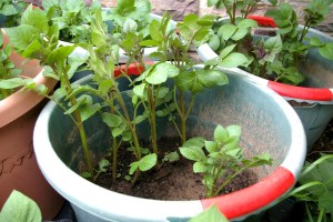 Fast jeder, dem ich aufgeregt von meinem Kartoffelexperiment erzählte, sagte routiniert und ungerührt „Ach ja, die Kartoffeln, die habe ich schon vor zwei Wochen gesetzt. Warum wartest Du so lange?“. Das was für mich neu und aufregend war, ist für manch anderen längst Gartenalltag. Das erste Foto mit den Kübeln sah recht trist aus. Nach drei Wochen waren die Pflanzen aber dann schon so hoch, dass ich das erste Mal Erde nachfüllte. Anhäufeln wie der Kartoffelkenner sagt. Nach dem zweiten Anhäufeln waren Kübel und Wannen voll. Mir blieb nur noch Warten.