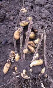 Nun ist Erntezeit. Nach und nach leere ich die Kübel und freue mich über das, was da gewachsen ist. Bisher habe ich Laura und Mayan Gold geerntet. Laura ist wirklich eine Freude. Frisch aus dem Garten in den Topf. Das ist eine ganz andere Qualität, als eine gekaufte Kartoffel bieten kann. Die rote Schale verblasst beim Kochen. Das Fruchtfleisch bleibt tief gelb. Für Mayan Gold war es zu trocken. Die Sorte ist sowieso recht klein. In meinen Kübeln habe ich pro Pflanze bestimmt 20 oder gar 30 Früchte – aber keine größer als 4 Zentimeter.