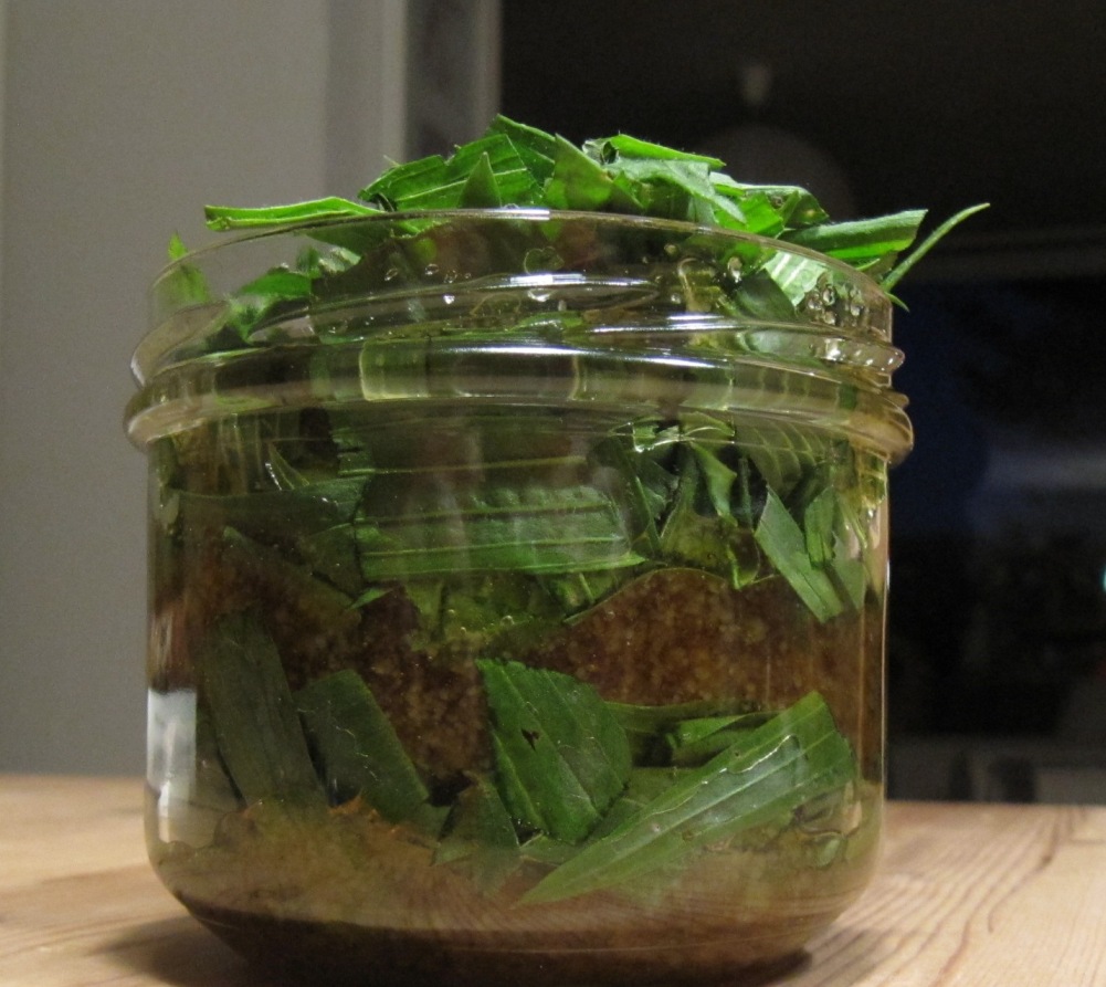 - In ein Marmeladenglas gebe ich schichtweise Honig und Spitzwegerich. Die letzte Schicht Spitzwegerich drücke ich möglichst fest ins Glas. Danach fülle ich wirklich völlig randvoll mit Honig.