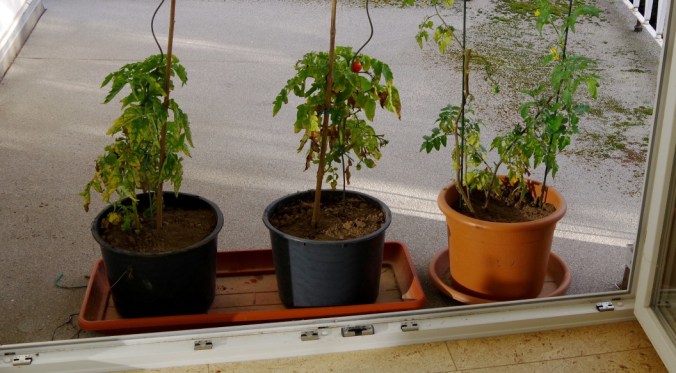 Ich experimentiere gerne mit Tomatenpflanzen. Außer echtem Frost vertragen sie ganz schön viel. Von November 2017 bis April 2018 habe ich eine Cocktailtomate auf der Fensterbank gepflegt und hatte im Mai 2018 die erste eigene Tomate. Dieses Jahr möchte ich nicht die frühe Ernte, sondern die lange Ernte ausprobieren. Ich möchte herausfinden, wie lange ich die Ernte verlängern kann, wenn ich die Pflanzen vor Regen und Frost schütze. Dafür kommen drei Pflanzen im Kübel auf den überdachten Südbalkon. Sobald es richtig kalt wird, kommen sie auf die gleiche Fensterbank, die mir jährlich ab Februar als Indoor-Frühbeet dient.