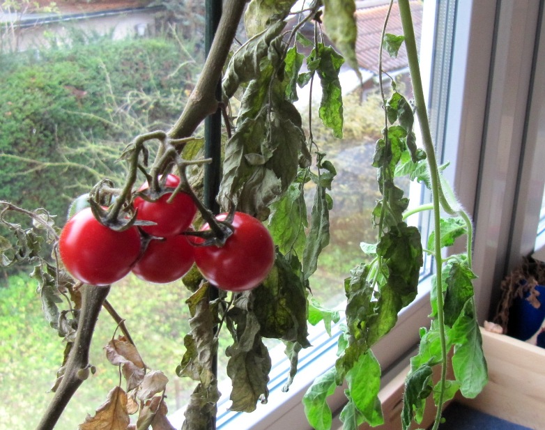 Ende September hatte ich drei Tomatenpflanzen ins Herbstquartier gebracht. Zuerst standen sie auf dem Balkon. Seit es unter 5 °C ist, stehen sie drinnen. Die Freiland-Pflanzen haben inzwischen längst aufgegeben. Zu wechselhaft und garstig ist das Wetter. Ein paar Frostnächte gab es schon. Von Schnee sind wir bisher verschont geblieben. Den Balkon- und Indoor-Pflanzen geht es dagegen gut.
