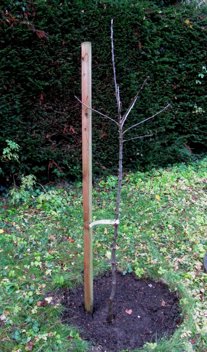Der Wind kommt meist aus Westen und so wird der junge noch nicht in der Erde festgewachsene Baum an dem Pfahl mit dem Seil fest gehalten.