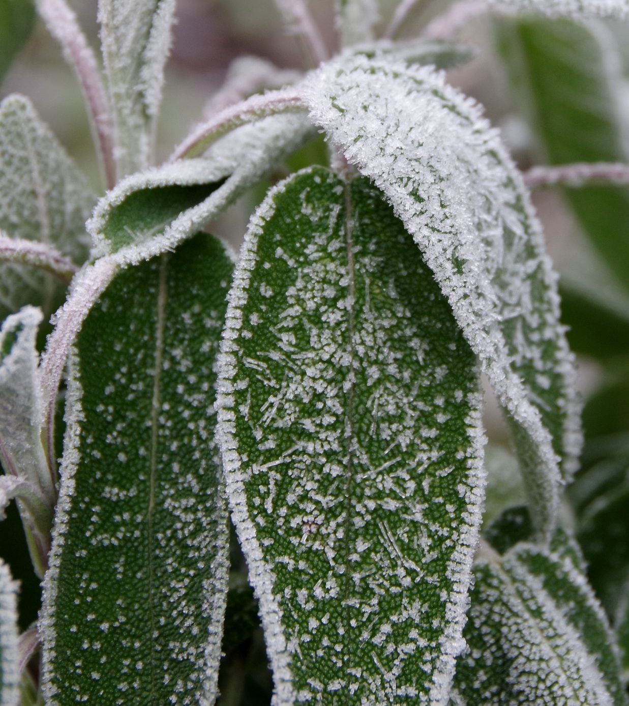 Salbei. Einzelne Blätter eines Strauches mit Eiskristallen überzogen.Das Jahr beginnt mit zwei nebelfrostigen Tagen. Ich blicke mit dem Sucher der Kamera durch den Garten und halte Ausschau nach den glitzernsten Eiskristallen.