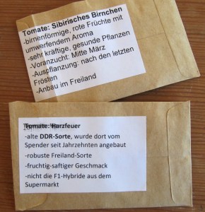 Bei der Saatgutbörse im Sandershaus (Kassel) habe ich die Tomate Harzfeuer ohne den Zusatz F1 entdeckt. Gerade Harzfeuer war für mich immer das Paradebeispiel für F1. Selbst der Name war für mich ein Synonym für die künstliche Erschaffung von Pflanzen. Welche Tomate würde freiwillig im Harz wachsen? Nichts als finstere Fichten, enge Täler und Schnee bis Ende Mai1. Aber nun liegt sie tütchenweise auf dem Campingtisch des Hobbygärtners: Harzfeuer, samenfest. Nicht die F1-Hybride aus dem Supermarkt!