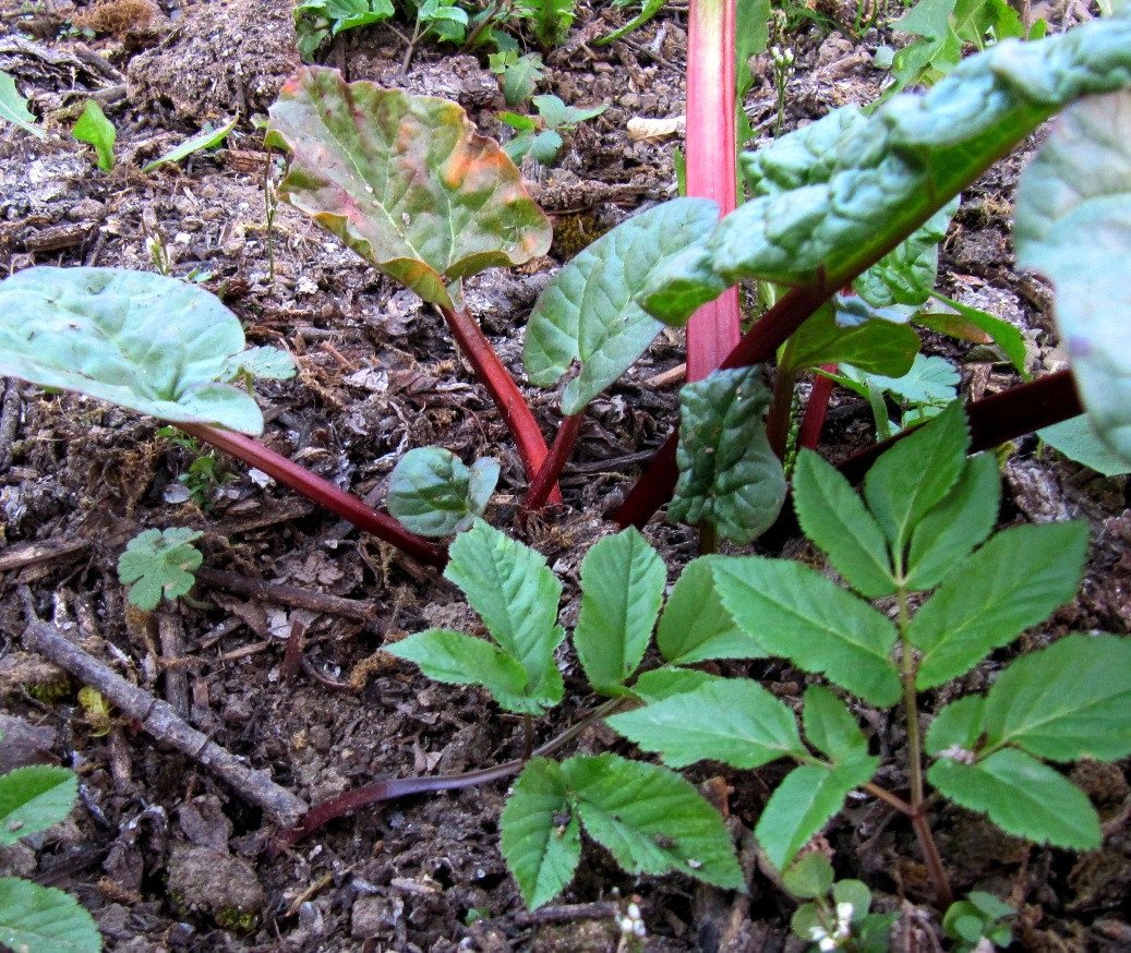 Während ich also noch übe, und versuche, das Konzept mit dem Kopf zu verstehen, hat mein Garten das schon einmal für mich umgesetzt: Zwischen dem Rhabarber hat sich der Giersch angesiedelt. Mir ist völlig unklar, ob und wie die beiden sich ergänzen. Ich hoffe, sie tun es.