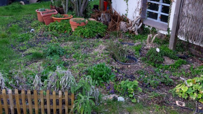 Es wird ein ziemliches Gedrängel werden. Es sieht immer so aus als wären Pflanzen festgewachsen und könnten sich nicht von der Stelle bewegen. Aber es gibt einen regelrechten Run auf diese sonnenschattige Fläche. Von wegen, dass Pflanzen sich ihren Platz nicht aussuchen. Da werden die Wurzeln zu Ellenbogen angespitzt und tausende winzige Blätter zu erdrückenden Teppichen ausgerollt. Es wird viel passieren, wenn der Salbeigarten erwacht.
