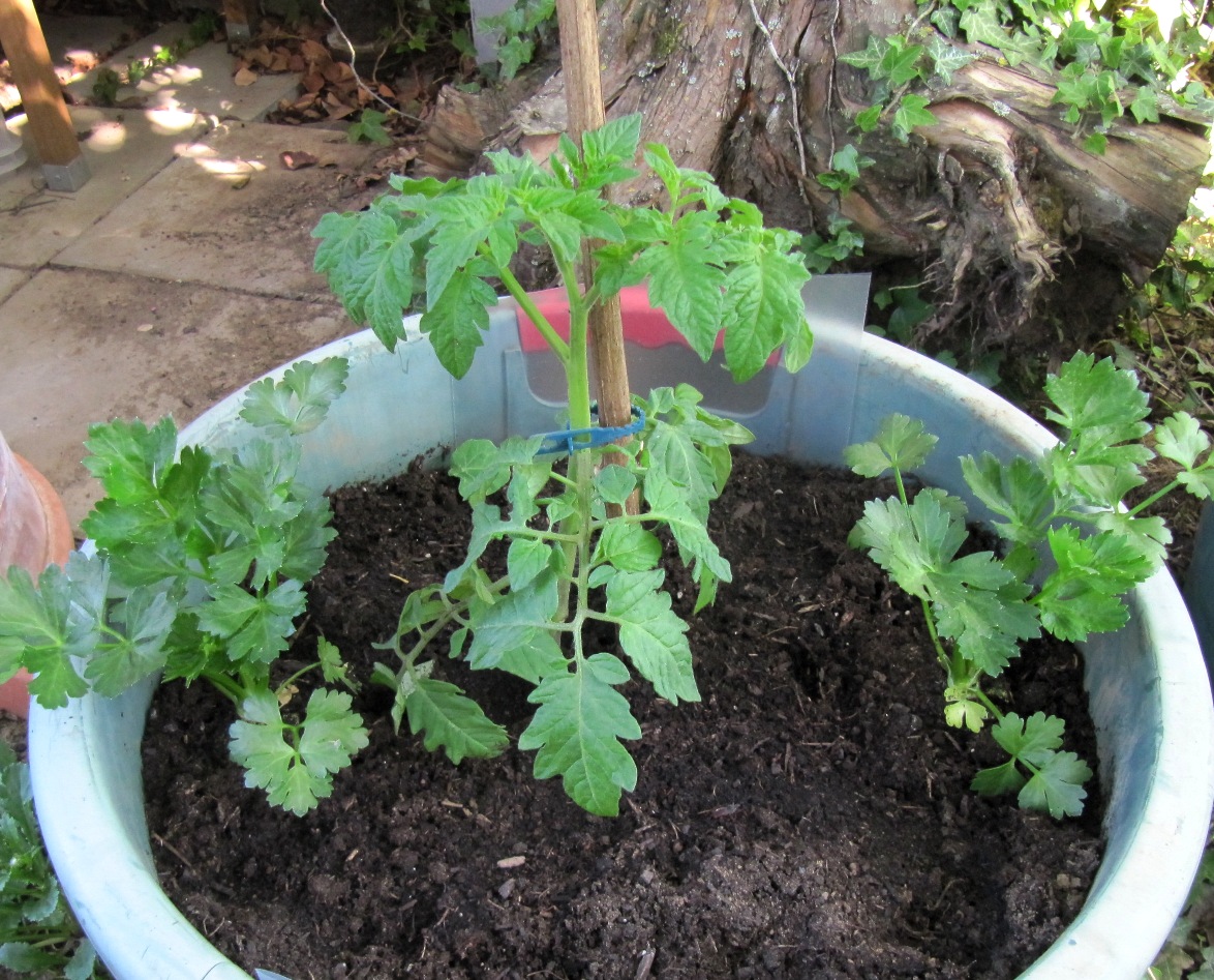 Nun habe ich nach Pflanzen gesucht, die sich mit Tomaten vertragen. Aus verschiedenen Listen im Internet habe ich mir Pflanzen herausgesucht, die zu mir und meinem Garten passen. In diesem Sommer baue ich Tomaten, Salat und Sellerie in einer Zusammen-Kultur an. Ich habe die Tomaten so gesetzt, dass zu ihren Füßen Platz für eine Reihe Salat ist. Die untersten Blätter der Tomatenpflanzen entferne ich sowieso. Die Tomaten bekommen regelmäßig Wasser. Salat und Sellerie versorge ich nebenbei mit. Während die Tomaten etwa zwei Meter in die Höhe wachsen, nutzen Salat und Sellerie die Fläche am Boden und die ersten 30 Zentimeter in der Höhe. In der Permakultur wird in mehreren Etagen angebaut. Der Ertrag jeder einzelnen Pflanze ist etwas geringer. Insgesamt wird auf der gleichen Fläche mehr geerntet, weil die Pflanzen sich den Raum untereinander aufteilen.