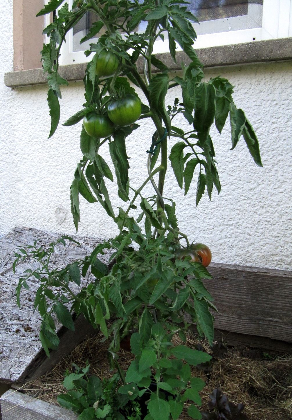 Tomatenpflanze der Sorte Tschernij PrinzSeit Februar berichte ich regelmäßig, wie es mir mit meiner Auswahl an fünf verschiedenen Fleischtomaten ergeht: Marmande, Rose de Bern, Ochsenherz, Tschernij Prinz, Brandywine pink. Sie alle schlagen sich recht wacker, obwohl sie weder mit einem Gewächshaus noch mit einem Unterstand verwöhnt werden. Von meinen fünf Sorten war Tschernij Prinz von Anfang an die kräftigste Pflanze. Nach dem Umzug ins Freiland wuchs sie nur noch langsam, setze aber recht früh Früchte an. Jetzt sind die ersten grünrotbraunen Früchte reif.