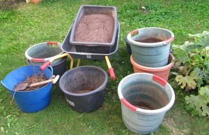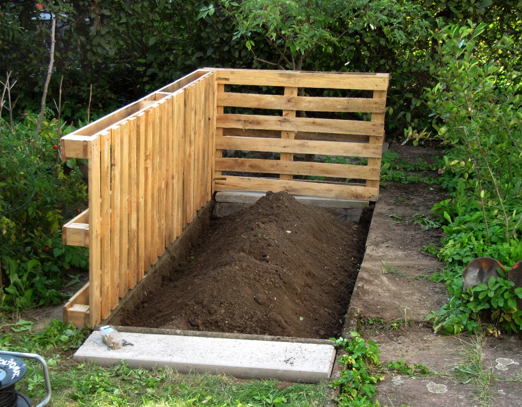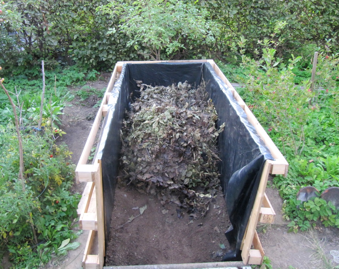 Den fertigen Holzkasten bespanne ich innen mit Teichfolie. Zum Befüllen lasse ich ihn anfangs an einer Seite offen, damit ich die ersten Schubkarrenladungen leichter einfüllen kann. Karre um Karre verschwindet im neuen Hochbeet. Die anfangs für riesig gehaltenen Vorräte an halbverrottetem Heckenschnitt und vom Sommer übrig gebliebene Pflanzkübeln (Kartoffeln und Bohnen) sind schnell aufgebraucht. Auch eine erste PKW-Ladung an neuer Erde der Kompostanlage verschwindet kommentarlos in dem schier endlosen Bauch des Hochbeetes. Noch sind einige sonnige Tage angesagt. Die werde ich zu einem weiteren Besuch bei der Kompostanlage nutzen.