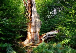 Auf meinem Weg durch den Urwald beeindruckt mich am meisten der Zerfall. Vielleicht, weil es das ist, was den Nichtmehr-Wirtschaftswald von anderen „Flächen mit Bäumen“ unterscheidet? Vom Sturm gefällte Bäume bleiben im Wald liegen. Über viele Jahre hinweg zerfallen sie langsam. Oder werden von Farnen und anderen Pflanzen überwuchert.