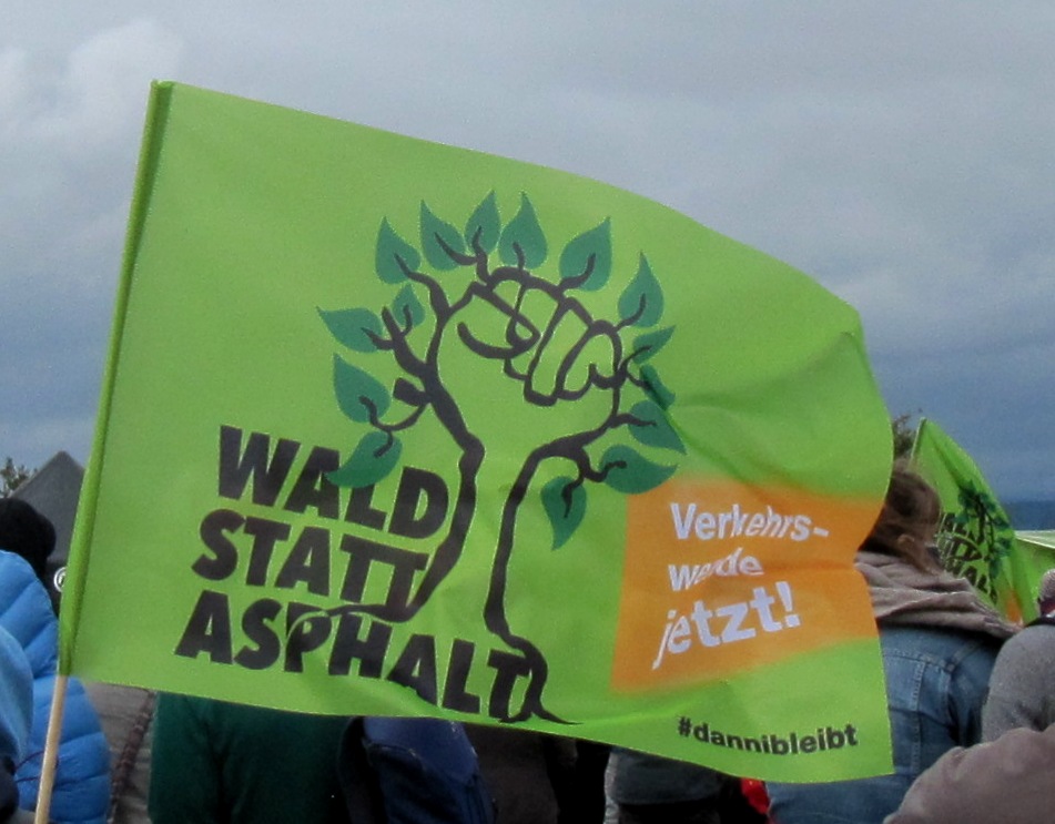 Längst hat der Klimawandel auch meinen Garten erreicht. Die Wiese ist monatelang braunverdorrt und die Hortensien habe ich umgesiedelt, damit sie weniger Sonne bekommen. Wenn ich durch den Wald vor meiner Haustür laufe, sehe ich die verdursteten und abgestorbenen Fichten. Häufig ist nun die Rede davon, dass dringend mehr Mischwälder aufgeforstet werden müssen. Doch statt aufzuforsten, soll nun ein viele Jahre alter Mischwald in einem Wasserschutzgebiet gerodet werden. Deshalb war ich heute in Dannenrod im Vogelsberg, um gegen den dort geplanten Weiterbau der A49 zu protestieren.