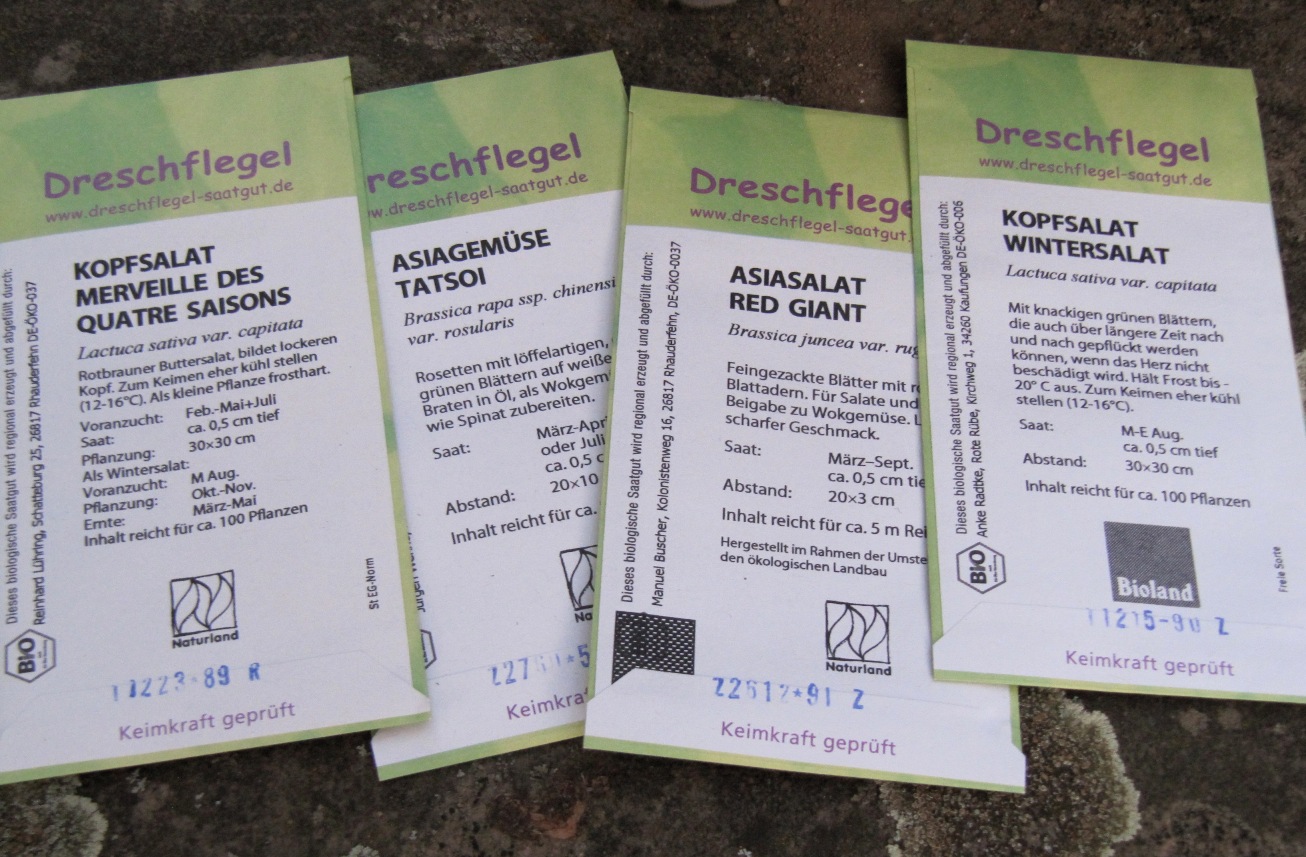 dem habe ich in den letzten Jahren die Erfahrung gemacht, dass viele „normale“ Salate und Gemüse winterfester sind als gedacht. Ein vergessener Wirsing hat im Frühjahr neue Triebe angesetzt und der Kopfsalat ist überhauptgarnicht erfroren. Ich traue den Pflanzen nun einfach zu, dass sie es trotz kürzerer und kälterer Tage schaffen, und säe Feldsalat, Spinat, Asiasalat Red Giant Tatsoi.