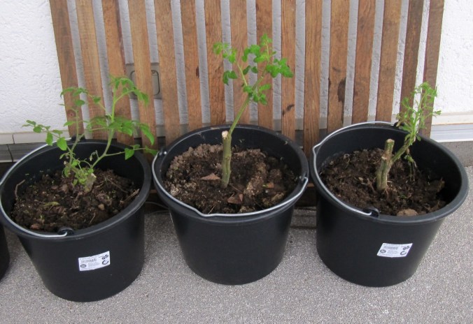 Der November ist in diesem Jahr mit einem frühen Frost nicht nur ein „Blütenkiller“, er hat auch meine Überwinterungstomaten ins Haus getrieben. Ich hatte die Tomaten in den letzten Oktobertagen gekürzt und umgetopft. Ich musste also nur meine vier Eimer schnappen und die große Fensterbank freiräumen. Statt großer Blumentöpfe verwende ich für solche Aktionen gerne einfach Eimer aus dem Baumarkt. Praktischerweise haben die Eimer einen Henkel und lassen sich damit viel leichter transportieren als gleich große Blumentöpfe.