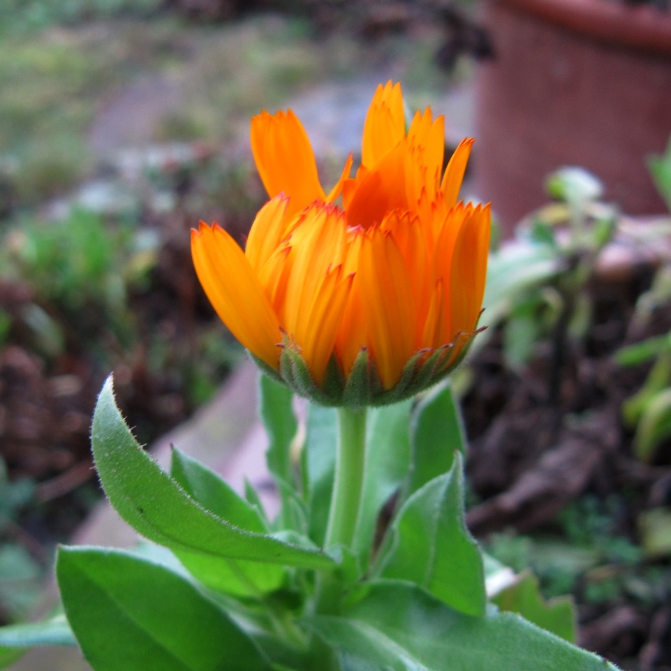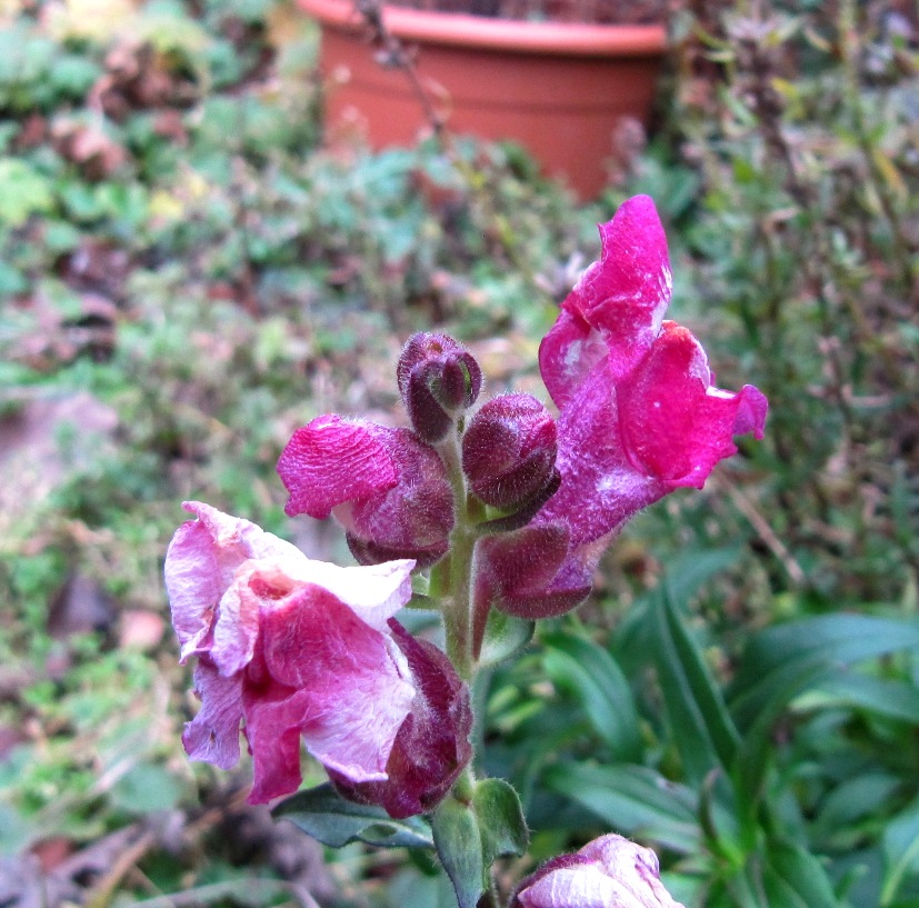 Nach dem frostigen November fällt es den Pflanzen schwer, noch einmal neu aufzublühen. Nicht einmal die ganzjährig wuchernden Wilden wie Pyrenäenstorchschnabel und Ruprechtskraut sind zu sehen. Die wenigen, die den Novemberfrost überstanden haben, haben Mühe durch den matschnassen und dunklen Dezember zu kommen. Die Vogelmiere versteckt sich mehr, als dass sie blüht und auch die Gänseblümchen ducken sich ganz tief auf den Boden. Die dritte im Bunde der Ganzjahresblüher wagt es noch eine der Knospen zu öffnen. Noch ist es keine vollständige Blüte, aber im Dezember gilt auch eine Knospe schon als Blüte.