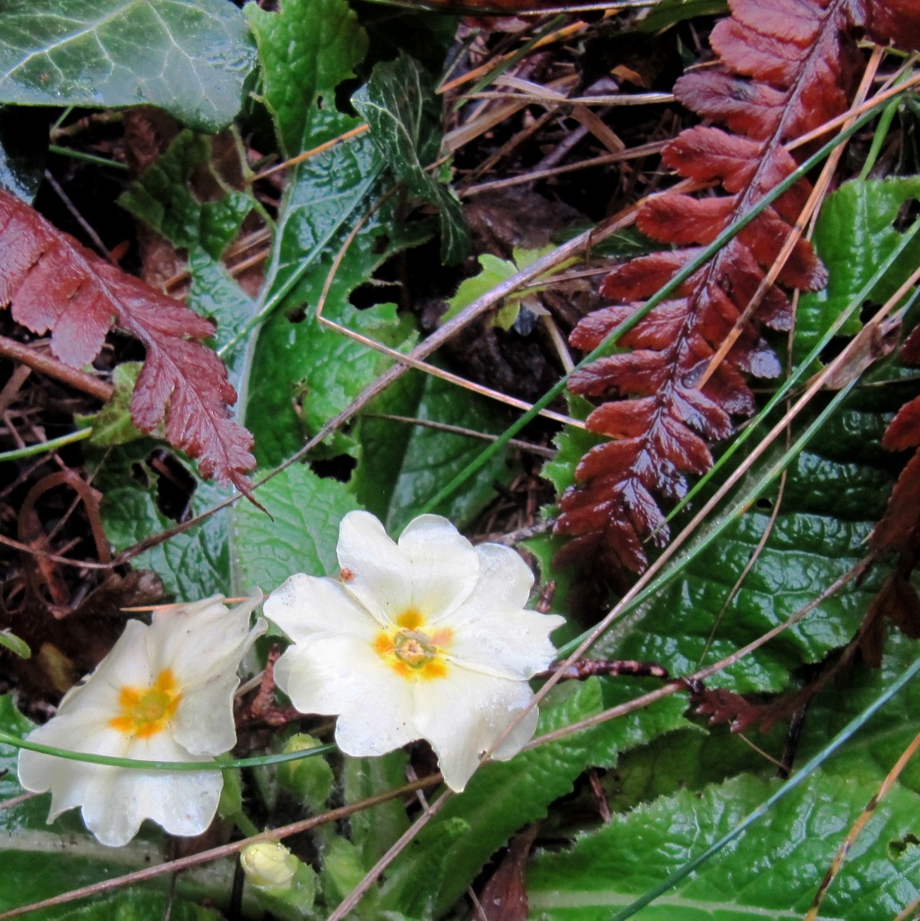 Nach der dritten Runde durch den Garten, immer mit suchenden Augen an jedem Fleckchen Grün, entdecke ich unter den abgestorbenen Farnblättern eine Primel. Eine Primel, um diese Zeit? Ich schaue ganz genau hin, aber es ist tatsächlich eine echte Pflanze. Ich selbst habe zwar Kugelprimeln (Primula denticulata) und Schlüsselblumen (Primula veris) gepflanzt, aber dieses Exemplar sieht mir nach der ganz normalen Zimmerprimel aus. Das müsste dann eine Becherprimel (Primula obconica) sein. Wie auch immer sie hier herkommt und weshalb auch immer sie jetzt schon blüht, es ist eine Freude, sie zu sehen.