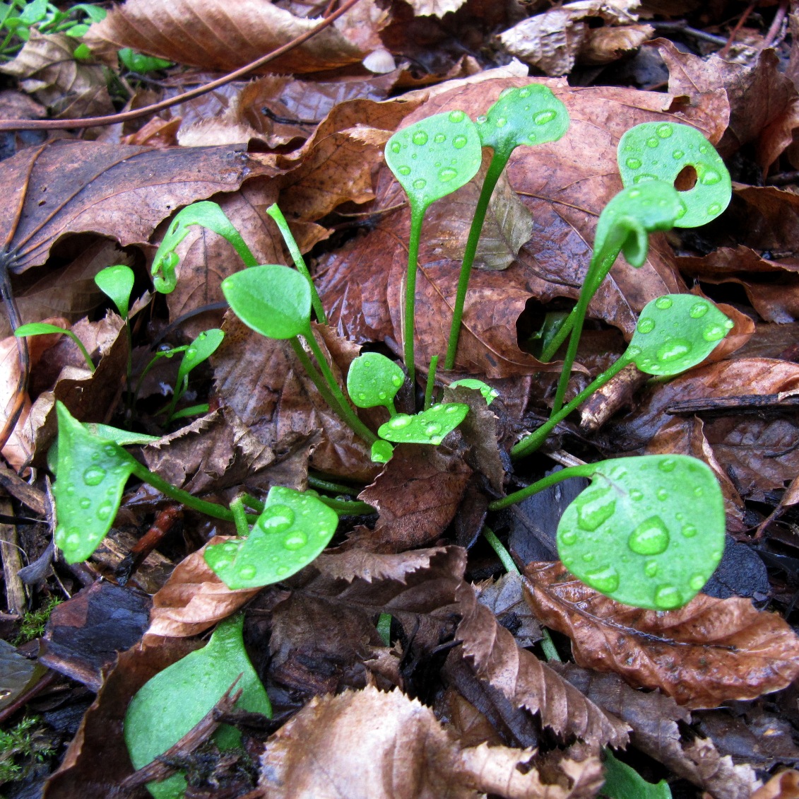 – Postelein, das ist das leckere Kraut, das im Winter wächst. Es wird auch WINTERportulak genannt oder Gewöhnliches Tellerkraut. Tellerkraut deshalb, weil während der Blüte die fleischigen Blätter zu einem Teller verwachsen, in dessen Mitte die Blüte ist. Auf Latein wird daraus dann Claytonia perfoliata.