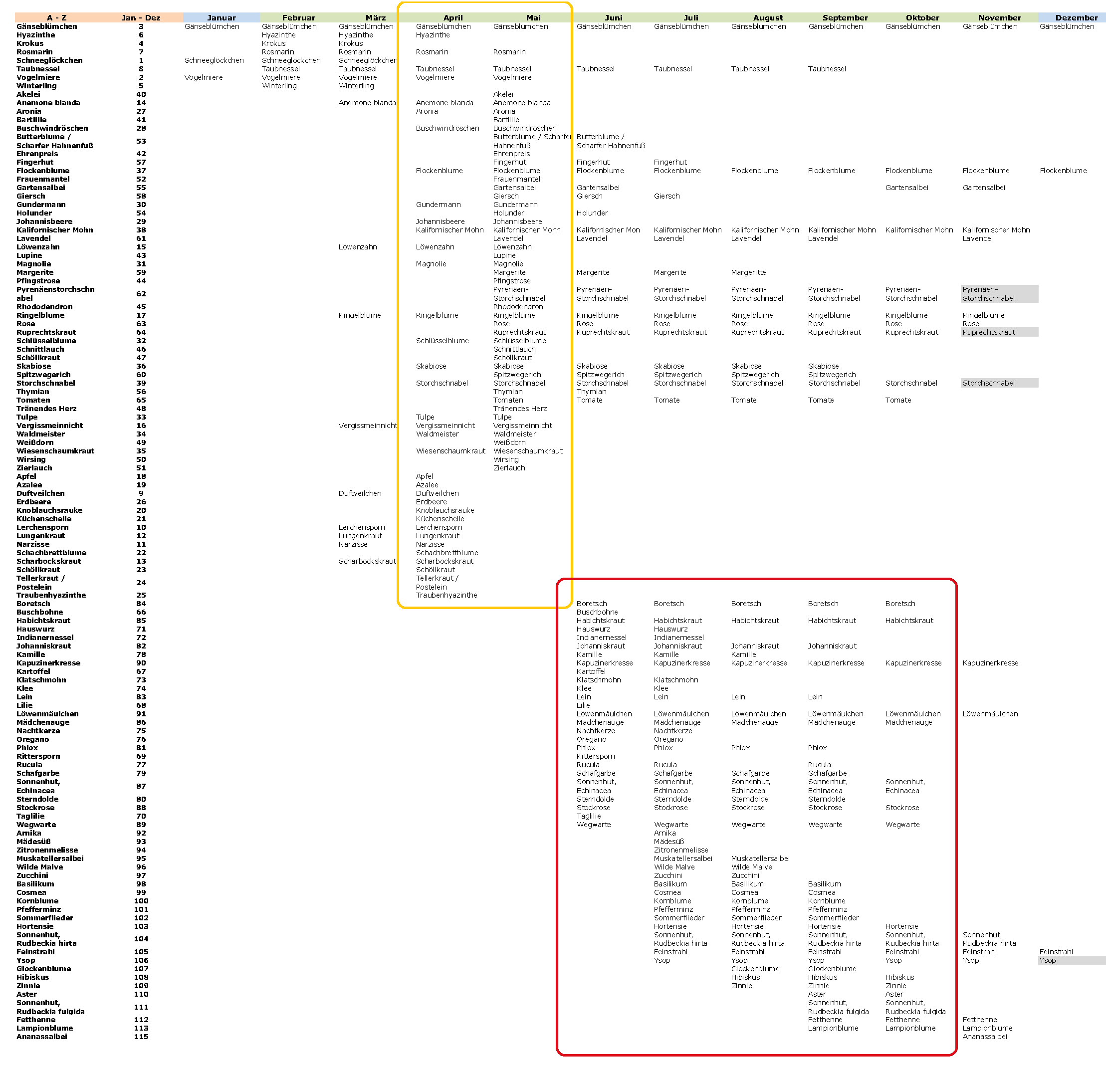 Oh wow! Ich hab 2018 – ausgerechnet in dem trockenen Jahr! Aber das konnte ich ja anfangs noch nicht wissen – auch eine Blühpflanzenzählung in unserem Garten durchgeführt, aber so einen Blühkalender hab ich daraus nicht erstellt.