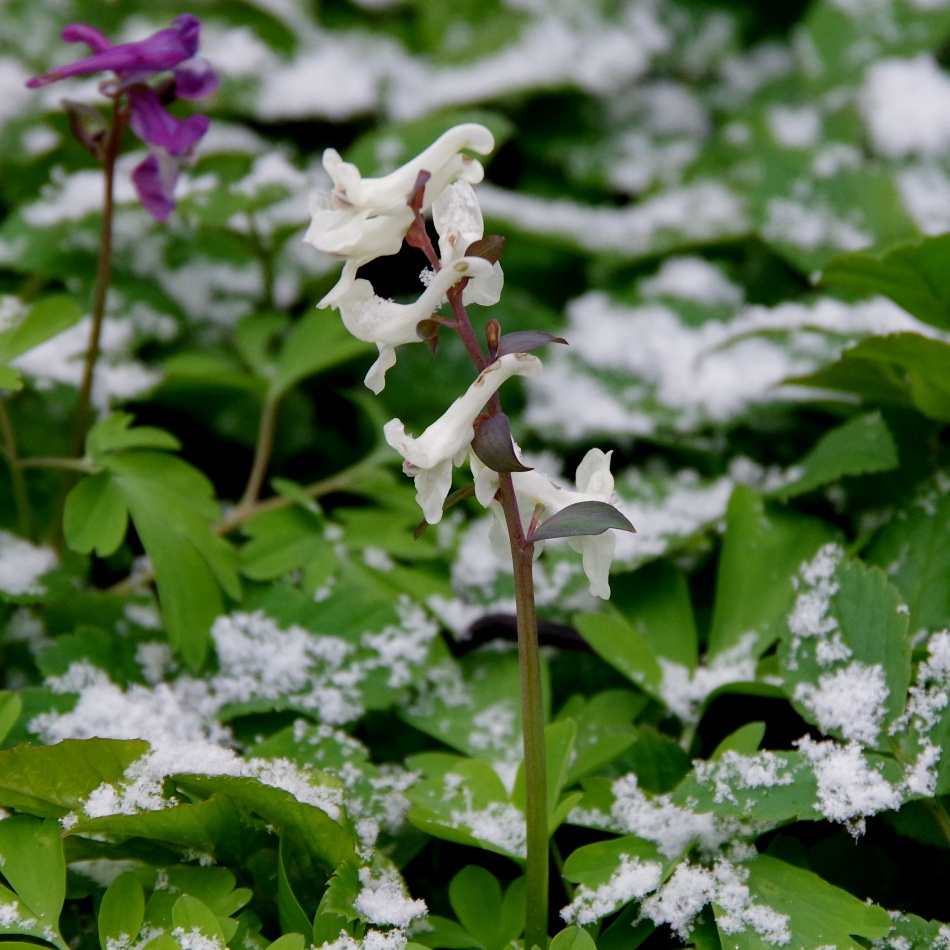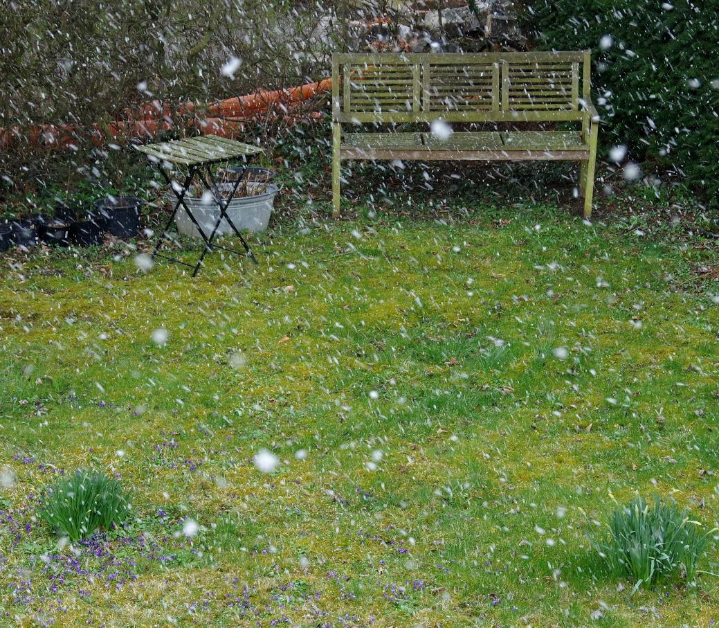 Doch es hilft nichts. Weißer Schnee und weiße Blüten bilden einen gemeinsamen Teppich.