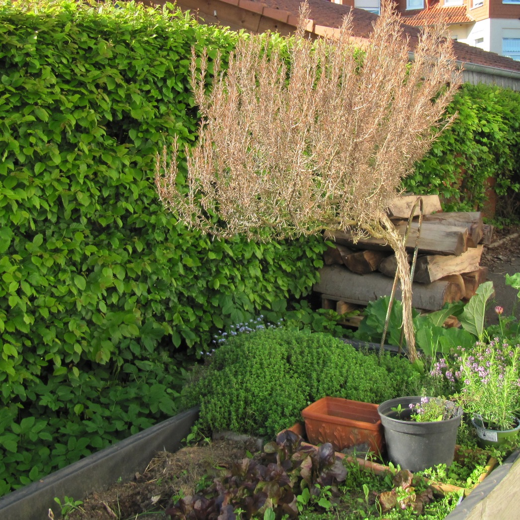 Der Sommerflieder war trotz jährlichen Rückschnitts ein ziemliches Monster geworden. Nun habe ich überraschenderweise Platz für weitere 4 Tomatenpflanzen. Im Laufe des Sommers kann ich mir dann überlegen, ob dies dauerhaft ein Tomatenplatz wird oder ob ich den Platz an eine zweite Felsenbirne vergebe.
