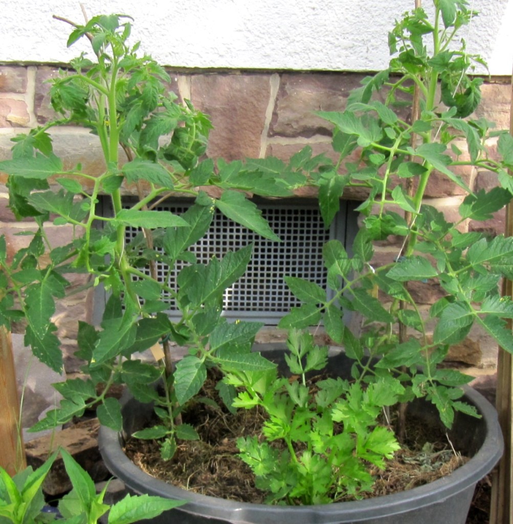 Die Tomatenkübel mulche ich mit einer dicken Schicht Rasenschnitt. Zusätzlich wächst in jedem Kübel noch Sellerie. Tomaten und Sellerie sind eine geeignete Mischkultur und beides Starkzehrer. So kann ich die Fläche besser nutzen. Ich hatte es mit Salat probiert, aber der ist zwischen Mulch und schnellwachsenden Unkräutern wie Melde und Vogelmiere verloren gegangen. Schließlich habe ich eben Melde und Vogelmiere als Salat gegessen. Für den „echten“ Salat gibt es inzwischen genug Platz in den Hochbeeten.