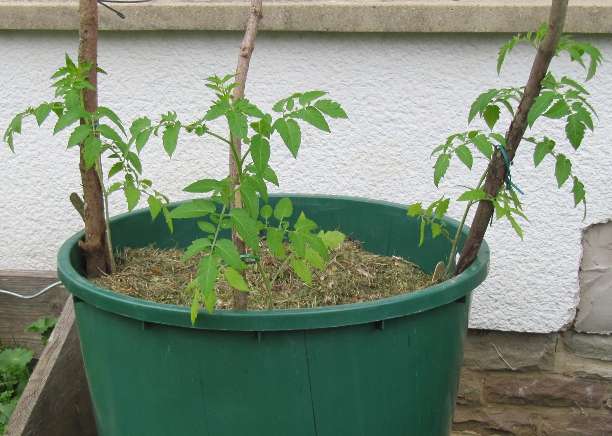 Die Hängetomate hat sich gut entwickelt. Auch die Seitentriebe wachsen nach oben, obwohl sie nicht angebunden sind. Erst wenn sie etwa 75 Zentimeter hoch sind biegen sie sich zur Seite. Durch die Höhe des Fasses liegt keiner der Seitentriebe auf der Erde. Die Hängetomate hat den sonnigsten Standort meiner Tomaten. Gleichzeitig ist er am wenigsten vor Regen geschützt. Die Krautfäule hat den Pflanzen bereits jetzt, bevor auch nur eine einzige Tomate rot ist, so sehr zugesetzt, dass ich viele Blätter und die Hälfte der Triebe abgeschnitten habe. Die Idee funktioniert also – aber ob ich in diesem Jahr etwas ernte ist ungewiss.