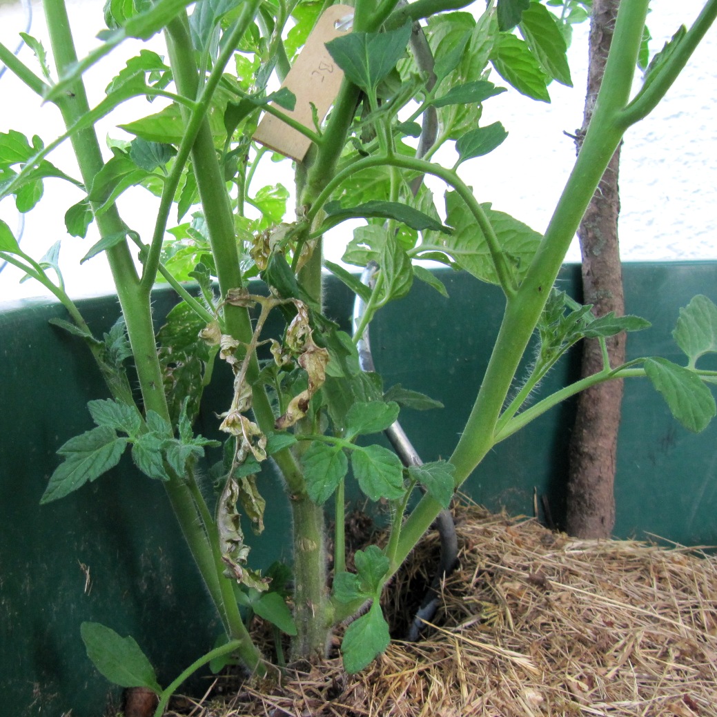 Die 6-triebige Stabtomate hat einen Platz mit weniger Regen. Auch sie leidet unter der Krautfäule, wenn auch weit weniger stark. Ich hoffe, dass sie wenigstens bis zur ersten Ernte durchhält.