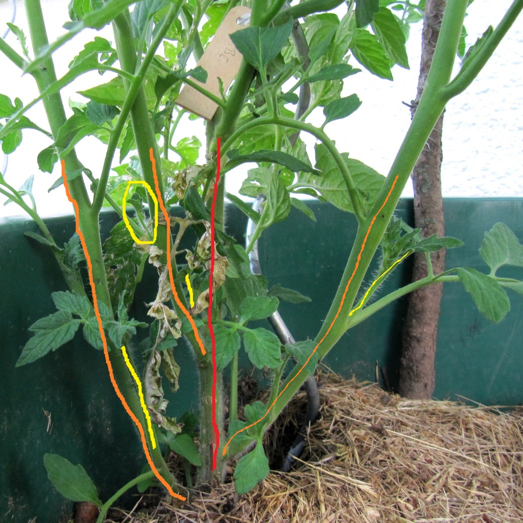 Die Tomatenpflanzen sind jetzt etwa vier Monate alt. Nun zeigen sich die Unterschiede zwischen „Stab“ und „Busch“. Die drei Pflanzen in der Regentonne haben sich von einem zierlichen Haupttrieb in einen wuchernden Busch verwandelt. Mittlerweile glaube ich, den Grund für meine Schwierigkeiten mit den Buschtomaten gefunden zu haben: Es bilden sich nicht nur Seitentriebe (orange) sondern auch Seiten-Seitentriebe (gelb). Auf diese Weise entsteht ein unentwirrbares Gewusel aus Trieben, Blättern und Blüten. Es mag sein, dass jede Blüte, die irgendwo in diesem Busch blüht, auch eine Tomate hervorbringt, solange es nur genug Sonne, Wasser und Nährstoffe gibt. Dennoch werde ich alle diese Seiten-Seitentriebe entfernen. Ansonsten bleibe ich bei meinem Plan der Hängebuschtomate und der 6-triebigen Stabbuschtomate.