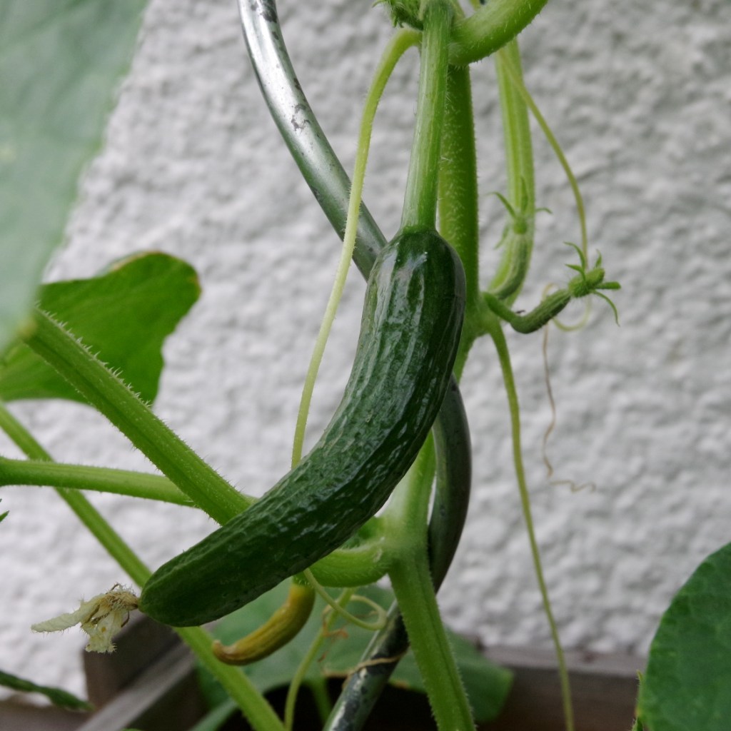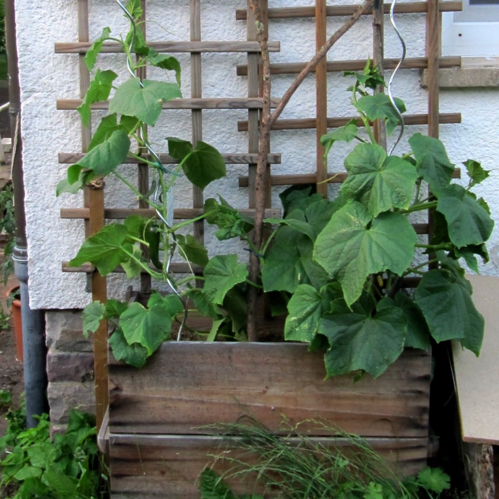Schließlich habe ich die Riesenschälgurke dann doch ausgesät. Gleich in einen großen Topf, weil Gurken das Umpflanzen nicht mögen sollen. Zwei der drei Pflanzen sind aber trotzdem eingegangen. Ob die Abneigung gegen das Umpflanzen mehr als ein Gerücht ist, kann ich nicht sagen, aber kühle Temperaturen sind definitiv nichts für Gurken. Sie „erfrieren“ schon bei +5 °C. Um nicht noch ein weiteres Jahr zu warten, habe ich dann zwei Pflanzen gekauft. Und zwei Butternutkürbisse gleich noch dazu. Von den Kürbissen dann demnächst mehr.