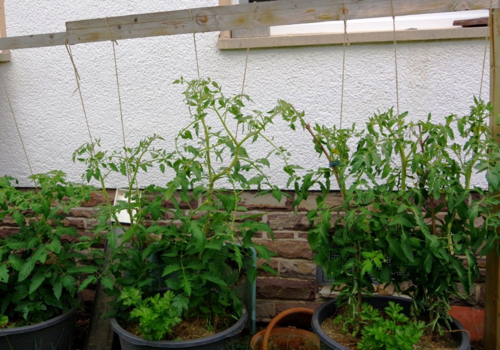 Im letzten Jahr hatte ich eine Holzkonstruktion gebaut, um die Spiralstangen in der Höhe Halt zu geben. Nun lasse ich die Spiralstangen einfach weg und binde eine stabile Paketschnur am Querbalken fest und winde sie um die Tomaten. Das klappt viel besser als diese störrischen Spiralstangen! Wenn sich zwei Triebe zu nahe kommen, dann lenke ich einen davon weiter zur Seite. Wenn ich einen zweiten Trieb an der Pflanze belassen will, binde ich eine weitere Schnur fest. Es ist so einfach! Dieses Jahr war es ein Experiment. Es funktioniert so gut, dass ich im nächsten Jahr für alle Kübel einen Querbalken montiere, und versuche, ganz ohne Stangen auszukommen.