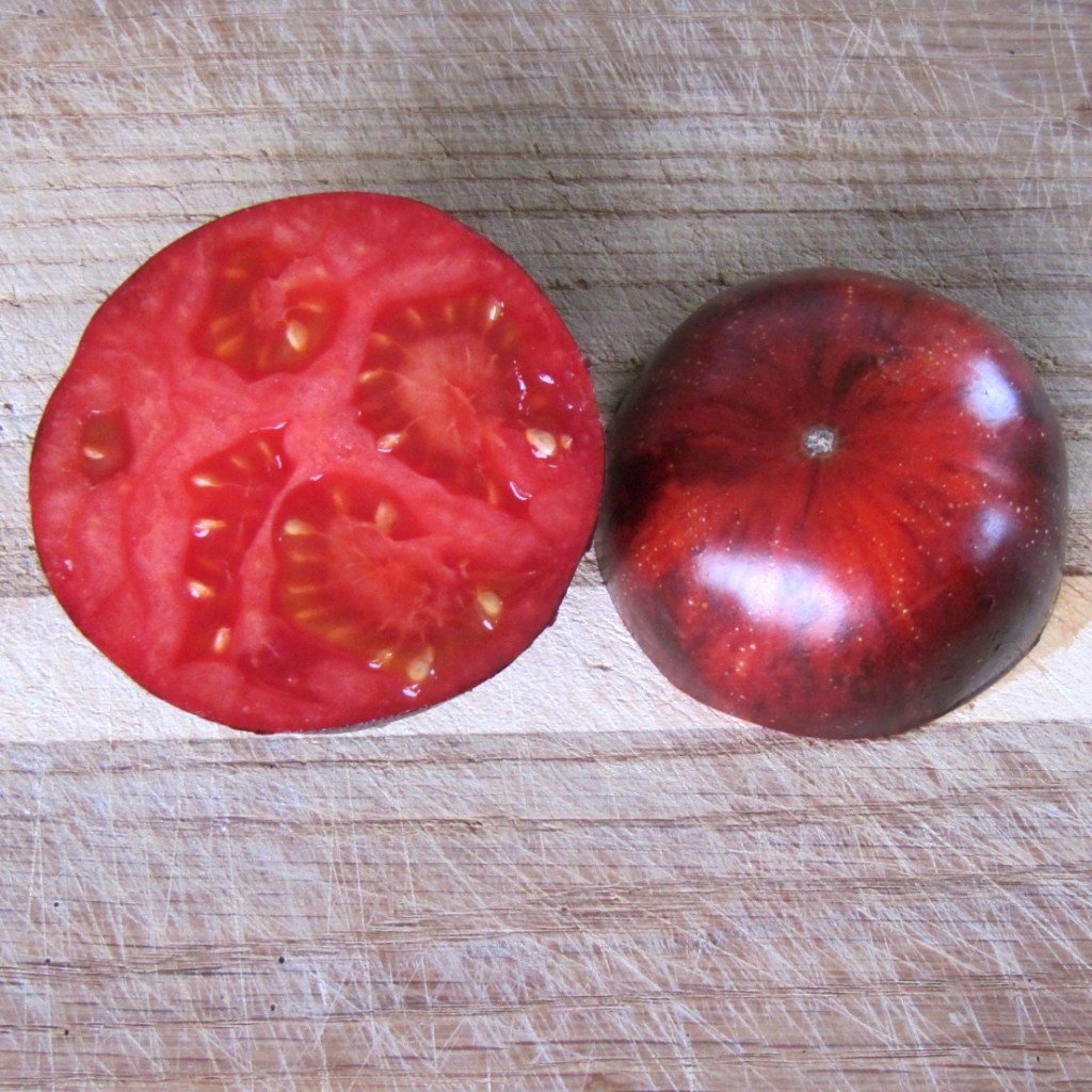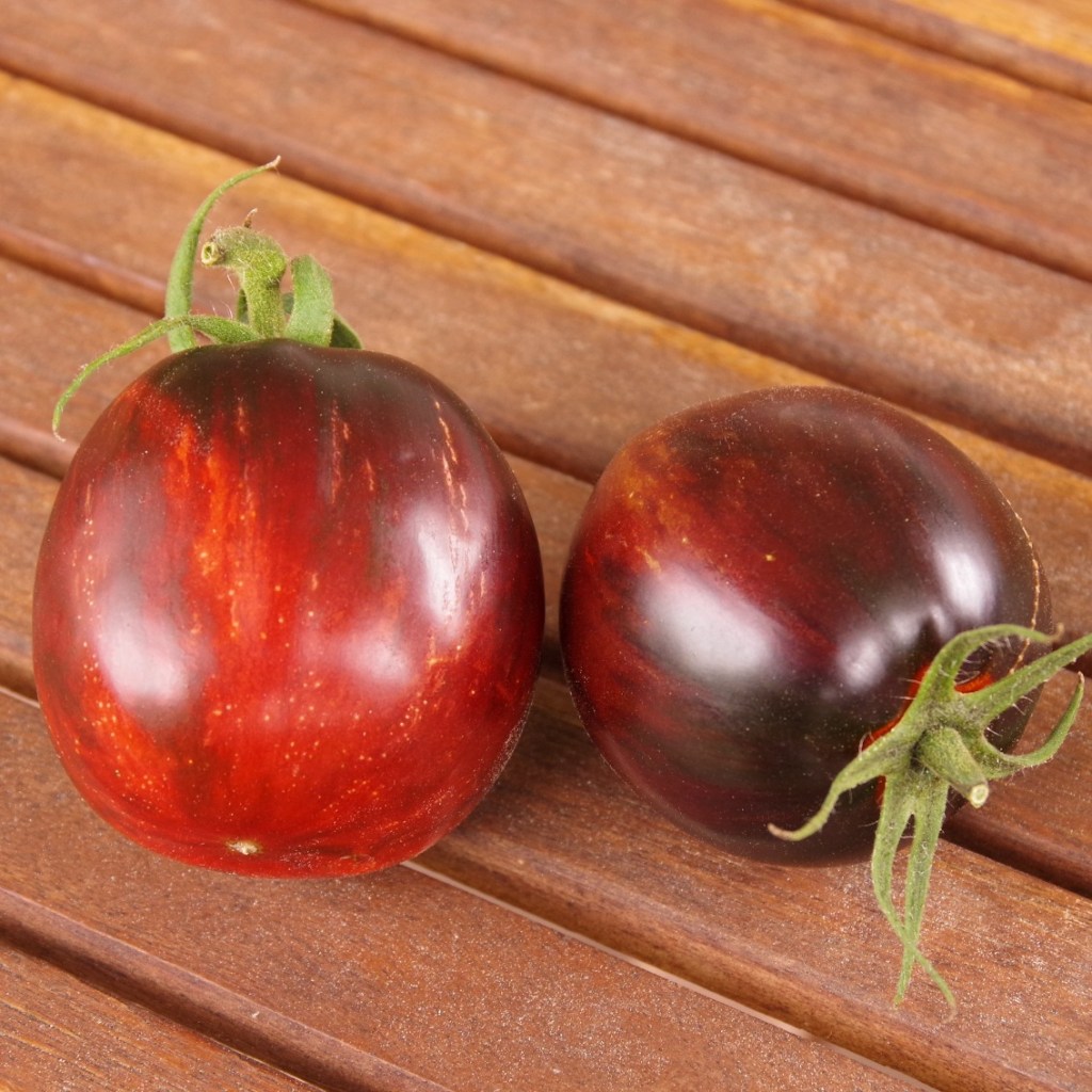 Die schwarze oder auch lila Farbe kommt von sogenannten Anthocyanen. Das sind natürliche Farbstoffe, die in blauen Beeren wie Aronia, Heidelbeere, Schwarze Johannisbeere vorkommen. Anthocyanen werden viele positive gesundheitliche Eigenschaften zugeschrieben. Daher wird es häufig als besonders wertvoll bezeichnet, wenn Tomaten auch Anthocyane enthalten. Es ist allerdings umstritten, wie die blaue Farbe in die Tomaten kommt. Da sich die verwendeten Wildformen (Solanum chilens) nicht mit der Kulturform der Tomate (Solanum lycopersicum) kreuzen lassen, wird eine der Gentechnik verwandte Methode eingesetzt. Die Beiträge des Blogs BioKultur und der Initiative dreschflegel erläutern das Pro und Contra der blauen Tomaten.