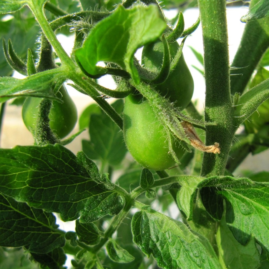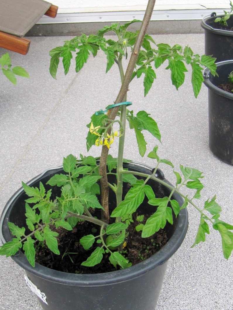 Die neuen Tomaten haben sich auf dem Balkon eingelebt. Sie sind gut gewachsen und aus den 10 Zentimeter großen Stecklingen sind nun 50 Zentimeter hohe, kräftige Tomatenpflanzen geworden. Alle sind weiterhin frei von Krautfäule. Zwei der Stecklinge hatten außer Blättern auch grüne Früchte. Diese Tomaten sind inzwischen bereits reif. Außerdem zeigen sich zahlreiche Blüten und einige neue grüne Früchte. Auch die Buschtomate aus dem Regenfass (Sibirisches Birnchen) hat sich gut entwickelt.