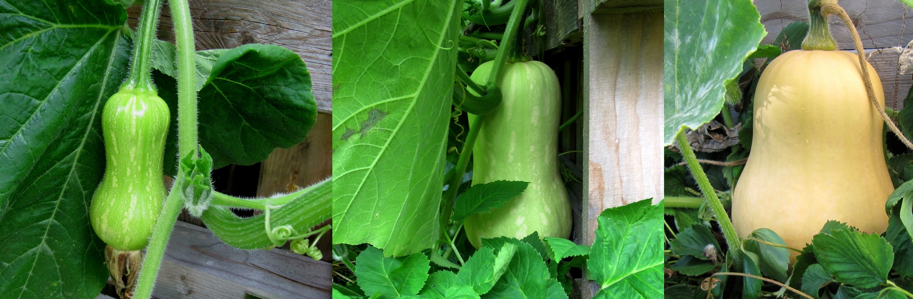 Anfangs war ich sehr unsicher, wann die Kürbisse reif sind. Bei den Butternut-Kürbissen lässt es sich gut an der Farbe erkennen. Entweder im Vergleich mit den eigenen Fotos oder mit den restlichen Kürbissen der gleichen Pflanze. Als der Kürbis keine grünen Streifen mehr hatte, habe ich ihn geerntet. Beim Aufschneiden in der Küche zeigte sich, dass es gut war, so lange zu warten. Den Tipp, auf den Kürbis zu klopfen und zu hören, ob er hohl klingt, kann ich nicht nachvollziehen. Bei Klopfen klingt der Butternut-Kürbis für mich eher, als sei er aus massivem Beton gegossen und nur gelb angemalt.