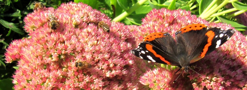 Neuankömmlinge sind neben dem Mauerfuchs auch der Kleine Feuerfalter und der Admiral. Mit dem Admiral sitzen gleich vier Bienen auf der gleichen Blüte. Eine Szene wie bei Paul McCartneys „Ebony and ivory live together in perfect harmony. Side by side on my piano keyboard, oh Lord, why don’t we?“