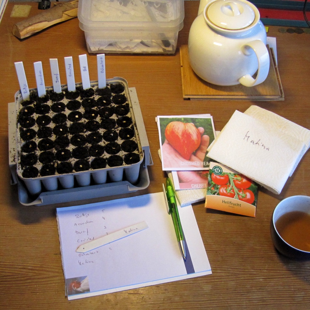 Ich lese gerade viel über Multitopfplatten und war fast schon überzeugt, dass dies auch für mich eine Verbesserung wäre – aber eigentlich funktioniert mein bisheriges System so gut, dass ich doch dabei bleibe. Auch Erdtopfpressen für selbsthergestellte Erdwürfel werden empfohlen. LED-Lampen sowieso. Und die Erde muss mager ( = Anzuchterde) beliebig ( = einfache Blumenerde) oder nährstoffreich ( = eigener Kompost) sein. Und das ist erst der Anfang der zahlreichen Methoden, die je nach Erfinder als unfehlbar oder zwingend notwendig beschrieben werden. Wenn ich vor solch einer Vielfalt an Bedingungen stehe, von denen sich die Hälfte gegenseitig ausschließt, denke ich meist: „Leute, macht euer Ding alleine. Ich bleibe bei Sachen, die ich verstehe.“