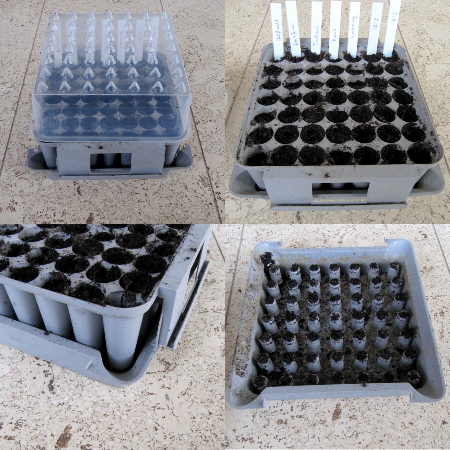 Die Methode, die bei mir am besten funktioniert sind Sämlingshäuser für 49 Pflanzen. Das ganze Kästchen ist quadratisch. Dadurch lassen sich der Mittelteil und er Deckel jeweils um 90 Grad drehen und bekommen neue Funktionen. Die Belüftung wird damit reguliert und die Sämlinge lassen sich, wenn sie groß genug aus den Kuhlen herausdrücken und ersetzt das Pikieren: Der Sämling wird mitsamt Erde nach oben geschoben, wandert in einen neuen Topf und wird mit Erde aufgefüllt.