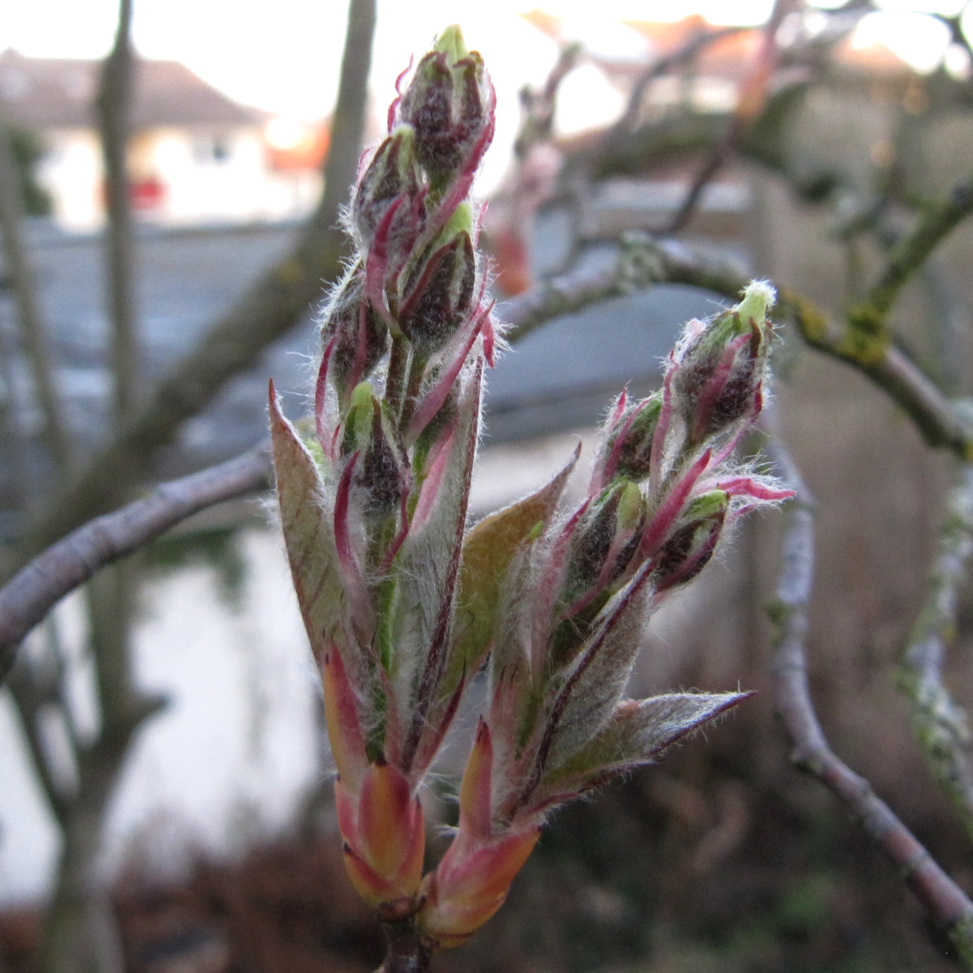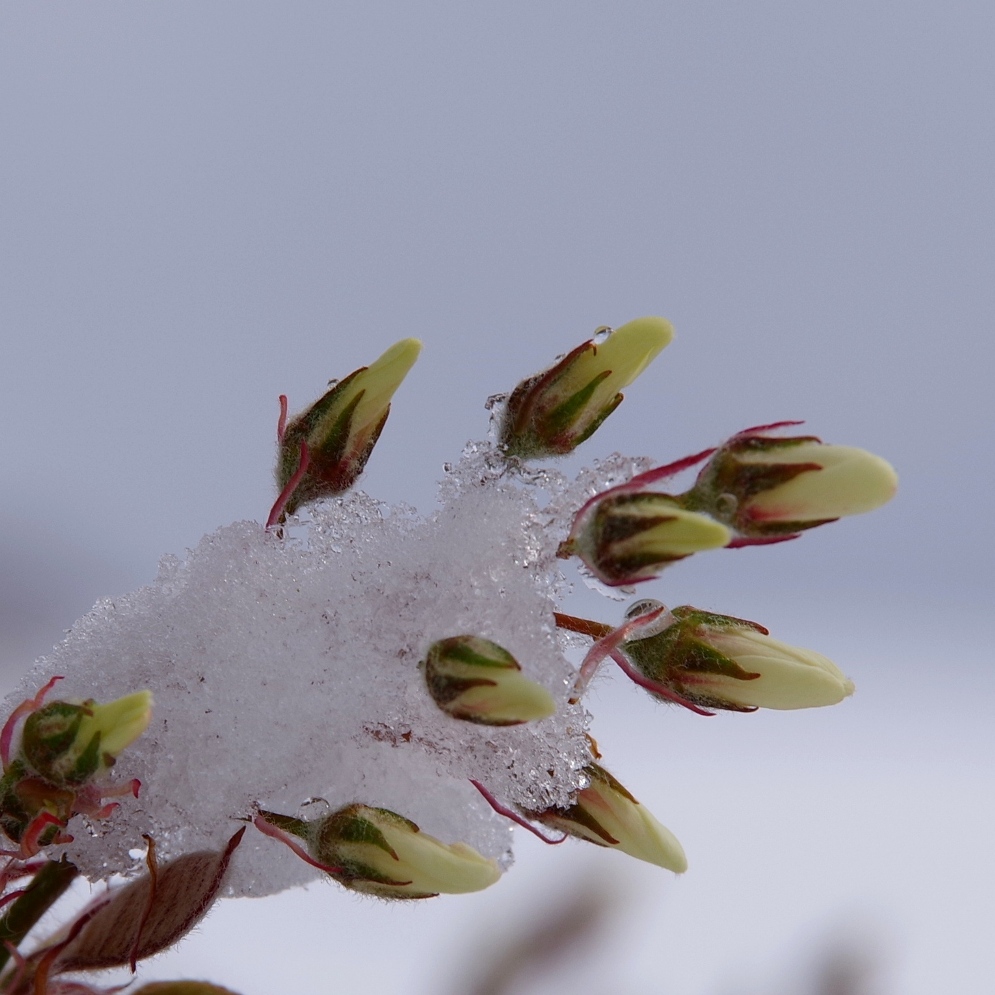Von Tag zu Tag entwickelte sich die Felsenbirne weiter. Lange steckten Blüten und Blätter unter einem wolligen Wärmeschutz, aber dann setzten sie an, zum Sprung in den Frühling – und es begann zu schneien.
