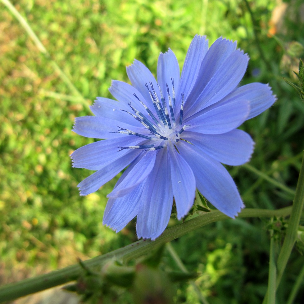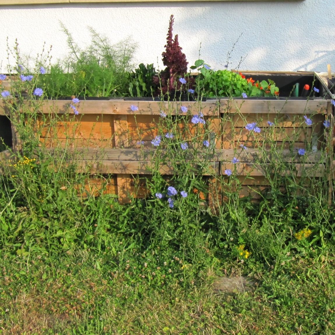 Verblühtes Habichtskraut und Wegwarten bilden die „Sowohl als auch“-Gruppe. Wegwarten sind eine meiner Sommerlieblingsblumen, aber sie müssen nicht die gesamte Wiese durchwuchern. Sie sind doch sehr gakelig. Oder sagt man sparrig dazu? Auf jeden Fall bleibt selbst nach dem Rasenmäher ein störrischer Strunk, über den ich bei dem Weg über die Wiese stolpere. Und sie haben einen unbändigen Ausbreitungsdrang. Einige kommen ohne Zögern weg. Über andere freue ich mich, dass sie Hochbeet und Wassertank begrünen.