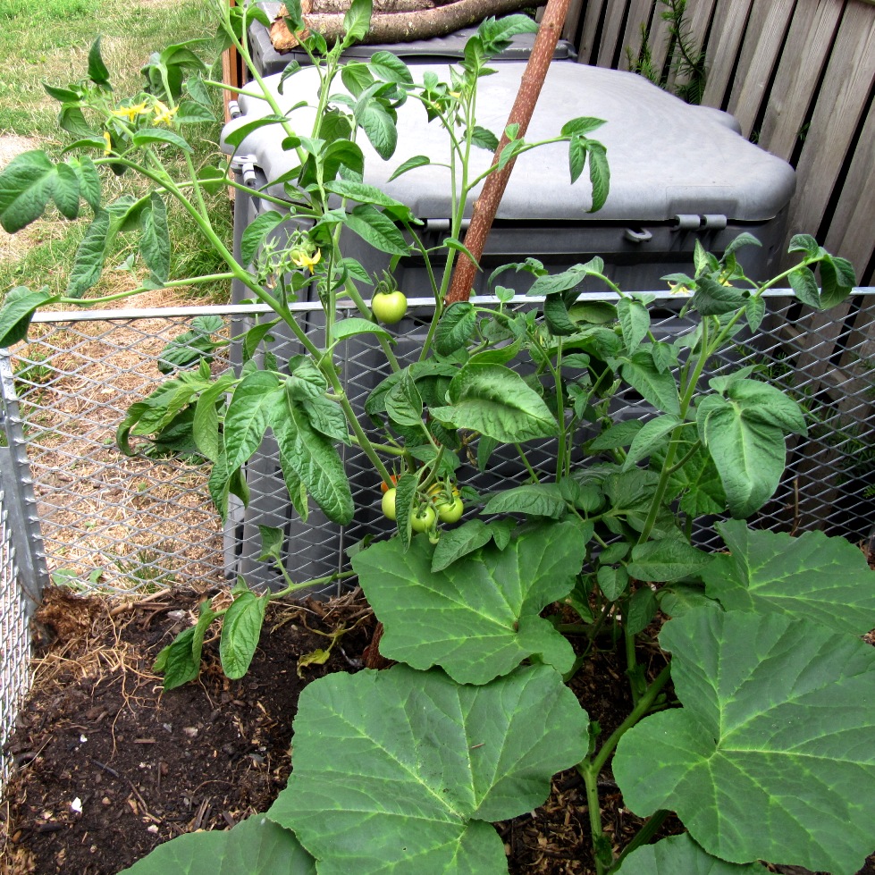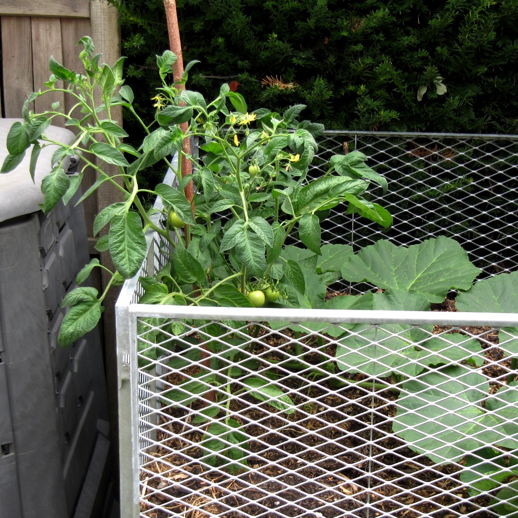 In diesem Jahr haben eine Tomate (Matina) und ein Kürbis sich gezielt eine gute Nährstoffversorgung ausgesucht. Tief im Innern des Komposthaufens ist es offensichtlich auch feucht genug, damit beide Pflanzen nicht vertrocknen. Außer einer Stütze für die Tomate habe ich mich um nichts kümmern müssen.