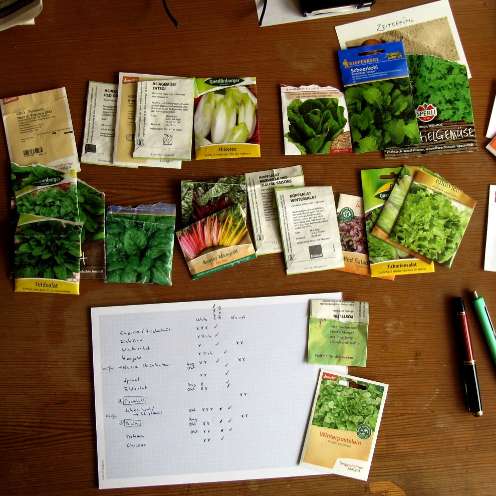 Im letzten Jahr war meine Winterernte ein Zufallserfolg. Das neue Hochbeet war erst im November fertig. Ich säte trotzdem noch aus – und überraschend viel davon gelang. 2022 säe ich zum ersten Mal ganz bewusst für die Herbst- und Winterkultur aus. Die Angaben der Saatgutpackungen sind dafür häufig nicht hilfreich, weil die allermeisten Salate noch immer für nicht winterhart gehalten werden.