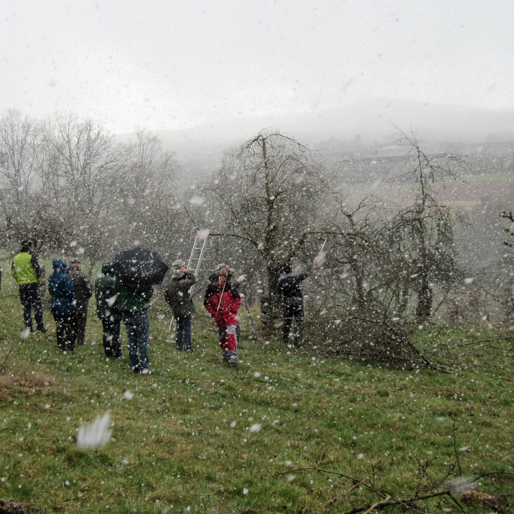 Wir schneiden munter drauf los und beraten im Team, welcher Ast, am ehesten der Schere zum Opfer fallen soll. Zwischendurch wird das Wetter noch einmal richtig garstig. Es ist doch noch Winter. Je nach Obstsorte hat der Schnitt im eigenen Garten noch Zeit. Meine Äpfel kann ich auch in zwei, drei Wochen noch schneiden. Aber den Kurs brauche ich ja vorher. Also ist mir der Schnee heute egal. Für den eigenen Garten suche ich mir dann besseres Wetter aus.