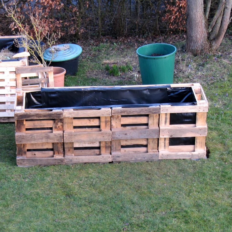 Die Paletten sind im örtlichen Baumarkt übrig. Anstatt Geld für die Entsorgung zu zahlen, werden sie verschenkt. In meinem Garten sind aus diesen Resten Stück für Stück vier Hochbeete entstanden. Altes nutzen, um Neues zu schaffen.