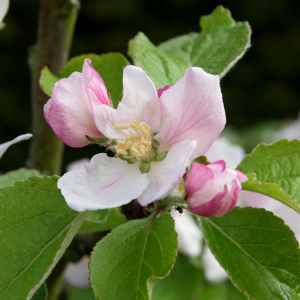 Im direkten Vergleich sehe ich die Unterschiede zwischen den Blüten der einzelnen Sorten. Cox Orange und Berlepsch sind sich recht ähnlich. Beide mit einem Hauch von rosa. Boskoop ist rein weiß.