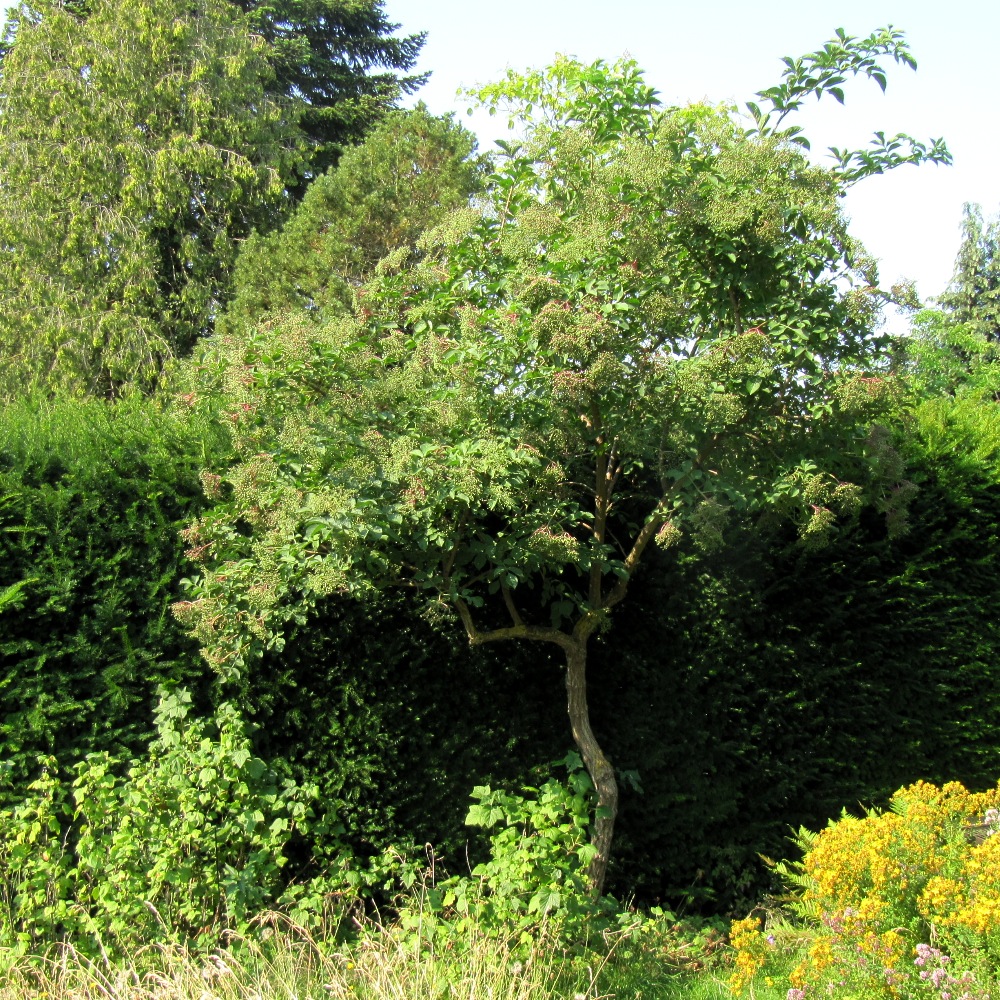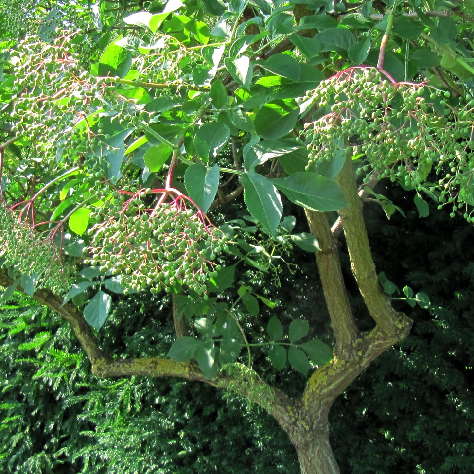Jahr für Jahr wird mein Morgenbaum höher. Anfangs konnte ich die wenigen Dolden im Stehen ernten. Mit den ausgestreckten Armen kam ich gerade noch an Blüten oder Früchte heran. Mittlerweile brauche ich die hohe Leiter.