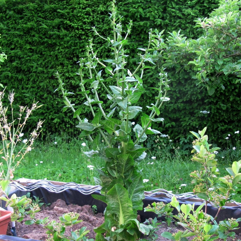 Ich habe eine der Chicorées nicht geerntet. Ich wollte herausfinden, wie der Chicorée sich im Sommer entwickelt. Als Verwandter der Wegwarte sollte er so ähnlich wachsen und blühen. Und richtig, recht schnell begann der schlanke Salatkopf in die Höhe zu wachsen und die sparrigen Seitentriebe der Wegwarte auszubilden. Heute hat er begonnen zu blühen. Etwas früher als die echten Wegwarten, die sich rund ums Hochbeet ausbreiten. Die Blüte ist ganz unverwechselbar hellblau. Genau wie die Wegwarten am Straßenrand. Wer also keine Wegwarten im Garten hat, der lässt einfach einen Chicorée blühen.