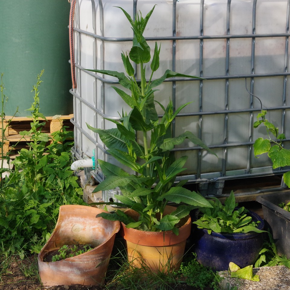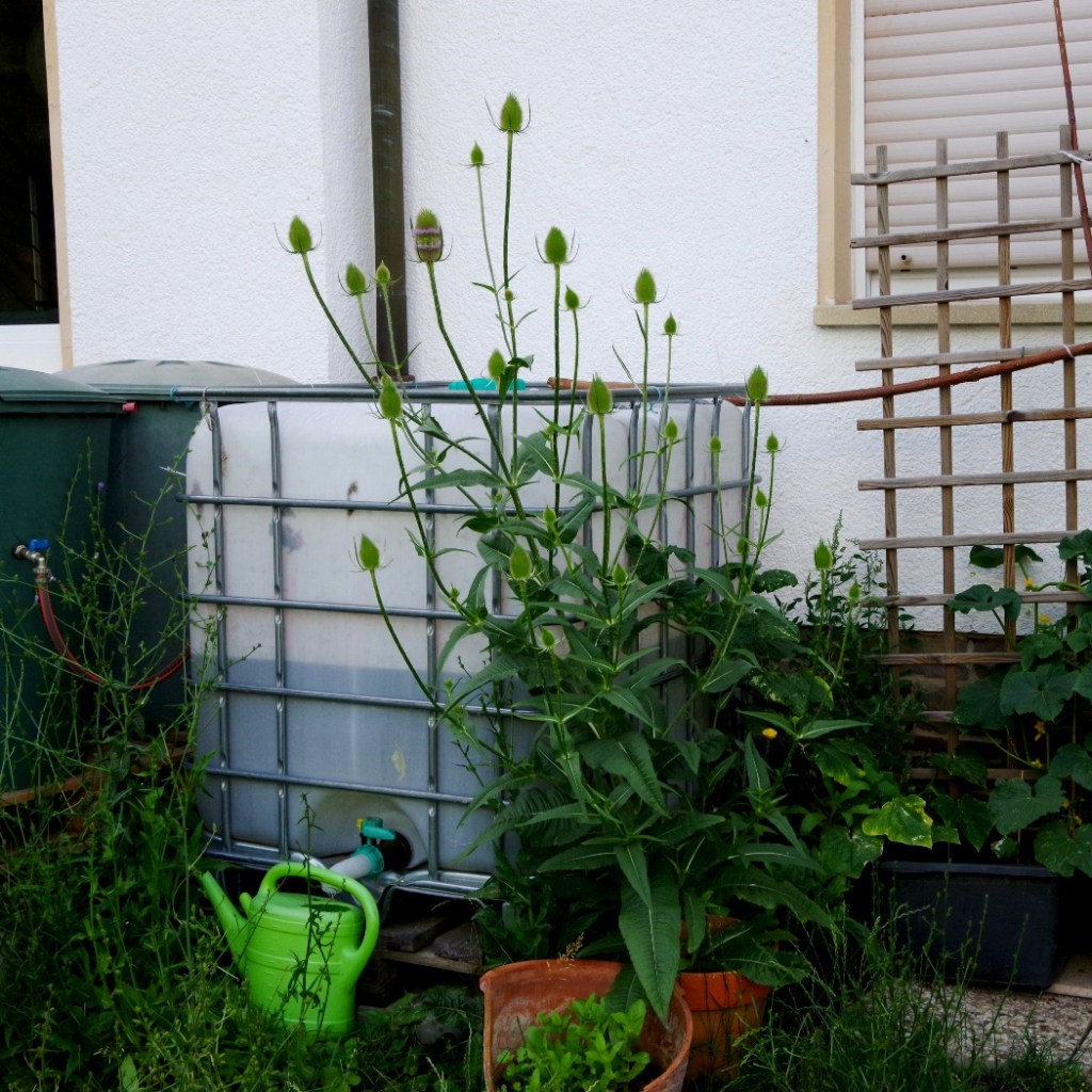 Der Versuch die Blätter an die Meerschweine zu verfüttern wurde von den Schweinen abgelehnt. Was bleibt, ist eine zwei Meter hohe und sehr wehrhafte Pflanze. Gemeinsam mit Gurke und Wegwarte engagiert sich die Wilde Karde dabei, die Wassertonnen zu verdecken.