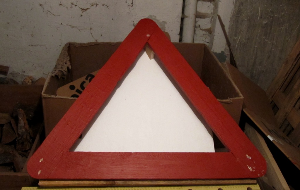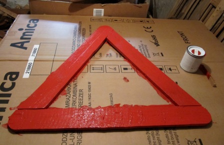 Doch wie so oft sind die Idee und die Umsetzung zwei ganz verschiedene Dinge. Lange ist mir nicht klar, wie ich die Umsetzung bewerkstelligen soll. Wie groß ist ein echtes Verkehrsschild überhaupt? Wie breit ist der rote Streifen? Sind alle Winkel wirklich gleich? Schließlich zeichne ich mit einer großen Pappe ein Verkehrsschild ab. Das sah wahrscheinlich recht lustig aus, als ich neben dem Verkehrsschild auf die Leiter kletterte, eine Pappe über dem Schild befestigte und mit einem dicken Filzstift Größe und Form abzeichnete.