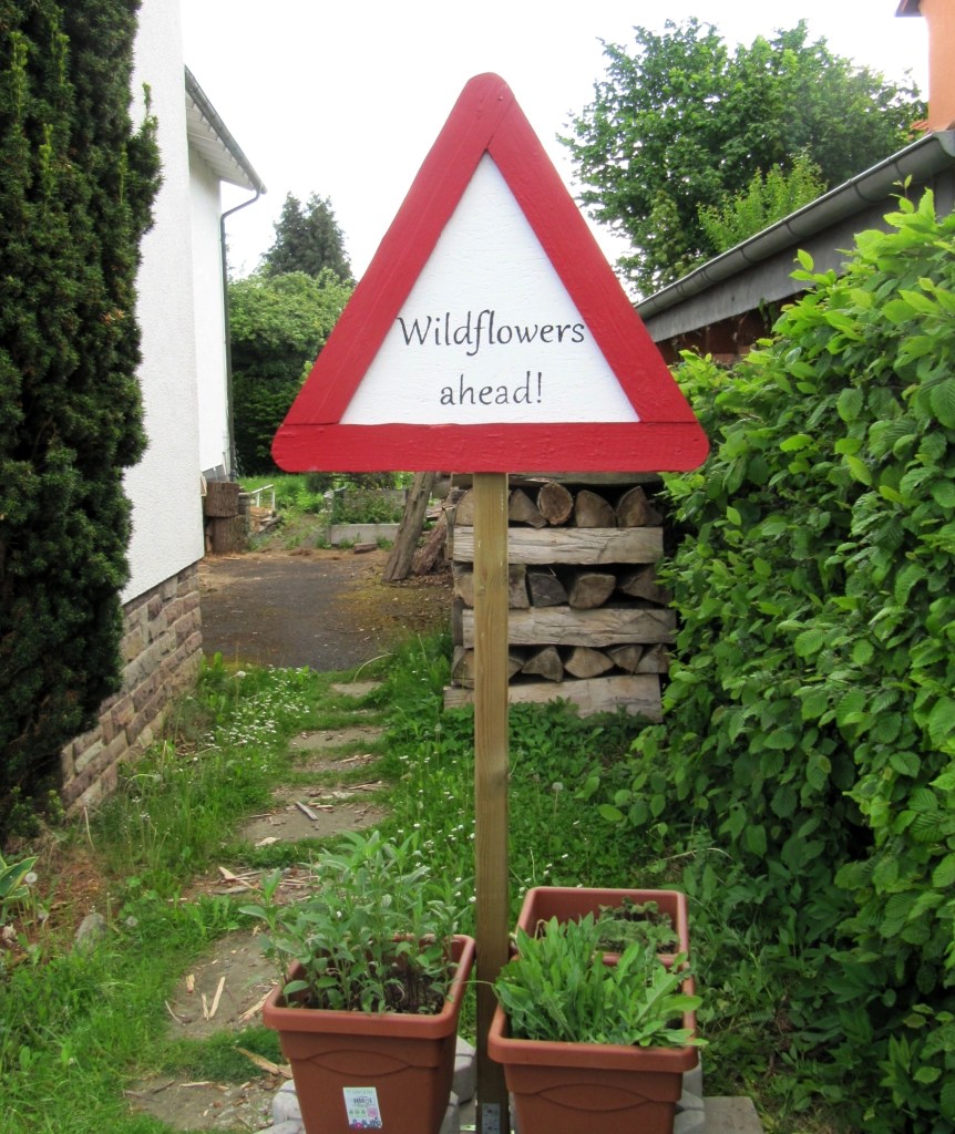Jetzt fehlt nur noch das ergänzende Schild mit der Erläuterung „Wildflowers ahead!“. Und natürlich muss es auf eine Stange montiert werden und am Garteneingang stehen. Ich überlege lange, welchen Text ich verwende. Die wörtliche Übersetzung „Achtung, (…) voraus!“ gibt es bei deutschen Verkehrsschildern nicht, auch wenn vielen Menschen sicherlich das australische „Kangaroo – Next 20 Miles“ bekannt ist. Für Wildkräuter gibt es Deutschland sowieso keine Schilder, aber auch die Versionen, in denen das Schild in Deutschland durchaus existiert, wie „Kindergarten“, „Zebrastreifen“ oder „Steinschlag“, verwenden keinen Zusatz wie „Voraus“ oder „Auf den nächsten Kilometern“. Also vielleicht „Wildkräutergarten“? Oder doch „Achtung Wildkräuter“? Wie ich es drehe und wende, nichts passt wirklich. Weder besteht der ganze Garten aus Wildkräutern, noch plane ich, eine Spezialgärtnerei zu eröffnen. Schließlich entscheide ich mich dann für „Wildkräutergarten“. Das gibt zwar nicht hundertprozentig die Stimmung des Originals wieder, aber es soll ja auch für jemanden, der den Kinofilm nicht kennt, verständlich sein.