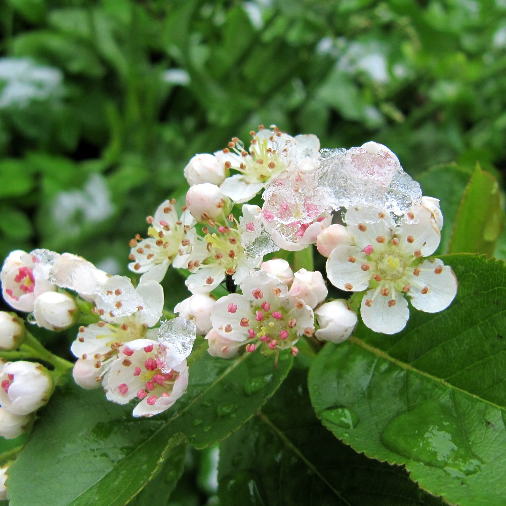 Sorgen mache ich mir eher um die Obsternte. Apfel und Aronia und stehen gerade in voller Blüte. Über Aronia habe ich gelesen, dass die Blüten sich gegen Frost schützen. Wie sie das genau machen, konnte ich nicht finden.