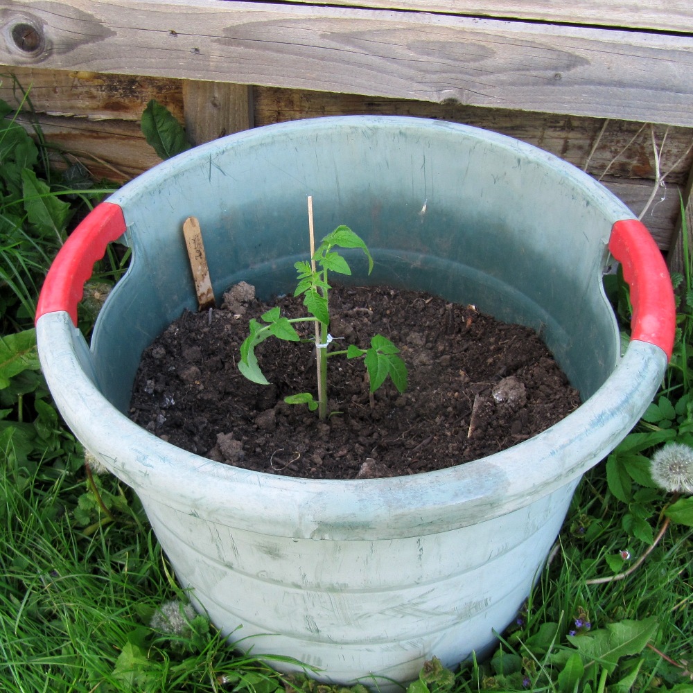 Für die Balkontomate Rotkäppchen ist heute schon Umzugstag. Sie zieht als erste nach draußen. Sie kommt in einen Kübel und wenn wirklich noch eine allerletzte Kaltfront durch den Garten fegt, kann ich den Kübel leicht schützen.